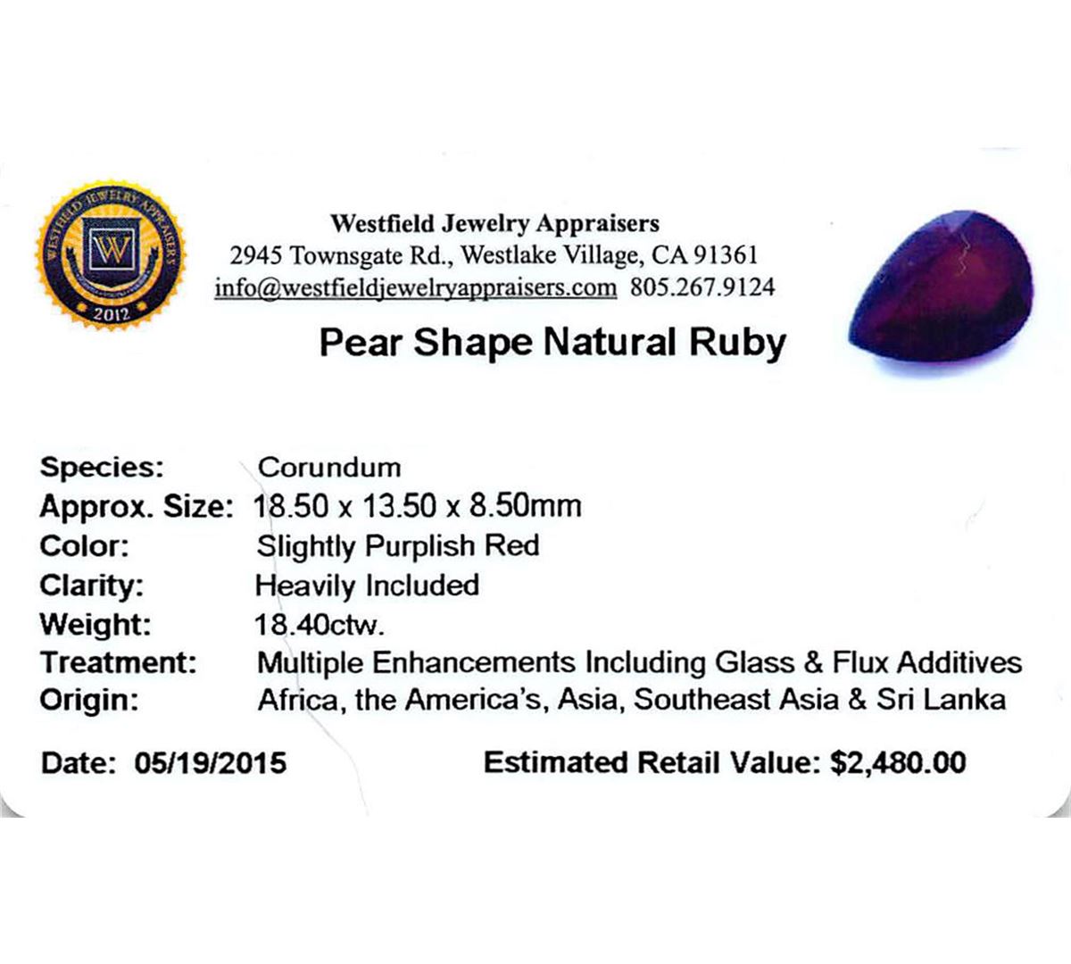 One pear mixed cut natural ruby, measuring 18.50 x 13.50 x 8.50mm, exact weight 18.40ct., clarity is heavily included, type II, dark, very slightly brownish, slightly purplish red color, (GIA slpR 7/3), cut is good. Transmitting light somewhat diffusely, transparent to translucent. Naturally occurring internal & external characteristics are present. Indications of laboratory high temperature heat treatment, with glass & flux additives. Ruby has a low tolerance to rhodium plating, repolishing the surface, & ultrasonic cleaning. Westfield Appraised at $2,480.00.