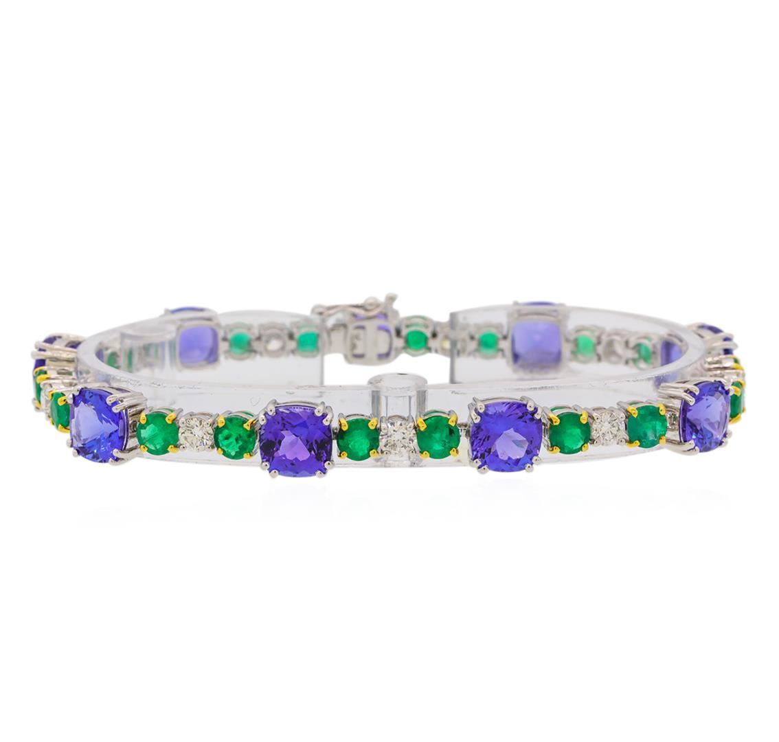 One electronically tested 18KT white and yellow gold lady's combination cast & assembled fashion bracelet with a tongue clasp with foldover safety with a bright polish finish. The featured lady's bracelet measures approximately 7.5 inches in length. Identified with markings of '18K'. Condition is new, good workmanship. Containing: Two prong set square cushion modified brilliant cut natural tanzanites, measuring 7.02 x 6.88 x 4.52mm, (depth est.) approximate total weight of 3.44ct., clarity is eye clean, medium dark, moderately strong, violetish blue color, (GIA vB 6/4), cut is good. Transmitting light with no distortion, transparent. Colored gemstones are presumed to have been subjected to commonly used enhancement processes. Graded in the setting. Seven prong set square cushion modified brilliant cut natural tanzanites, measuring 7.55 x 7.45 x 4.87mm, (depth est.) approximate total weight of 15.07ct., clarity is eye clean, medium dark, moderately strong, violetish blue color, (GIA vB 6/4), cut is good. Transmitting light with no distortion, transparent. Colored gemstones are presumed to have been subjected to commonly used enhancement processes. Graded in the setting. Eighteen prong set round modified brilliant cut natural emeralds, measuring 4.75 - 4.10 x 2.88 mm, (depth est.) approximate total weight of 6.30ct., clarity is moderately included, medium, moderately strong, green color, (GIA G 5/4), cut is good. Transmitting light somewhat diffusely, transparent to translucent. Naturally occurring internal & external characteristics are present. Indications of oil residue. Colored gemstones are presumed to have been subjected to commonly used enhancement processes. Graded in the setting. Nine prong set round brilliant cut diamonds, measuring 4.10 - 3.95 x 2.54mm (depth est.) approximate total weight of 9 Stones = 2.26ct. Graded in the setting. Clarity VS-2 to SI-1. Color: G - H Cut Good. Total Weight of Colored Stones 24.81ct.. Total Weight of Diamonds 2.26ct.. Total Weight of Bracelet 24.00gm. GAS Appraised at $39,000.00.