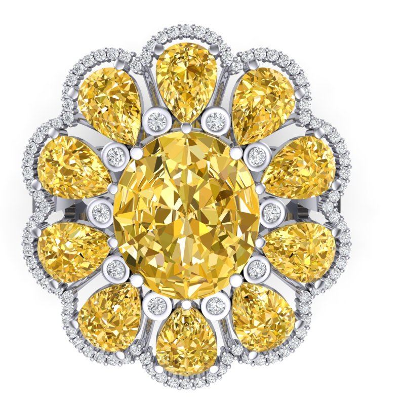 18.53 CTW Royalty Canary Citrine & VS Diamond Ring 18K White Gold ---- Luxury Designer Brand RIng Appraised Retail Price at $21,000 ---- SKU Number US39150 18K White gold RIng Size is 7, RIng measuring approx. 1 1/4 x 1 1/8 Inches, weighing in total approx. 21 grams. Made in the USA and is stamped 18K, Main stone 7.87 carat total weight containing 1 pieces of Translucent Canary Yellow color with AAA quality Oval shape cut Citrine Fancy , Stone #2 9.66 carat total weight containing 10 pieces of Translucent Canary Yellow color with AAA quality Pear shape cut