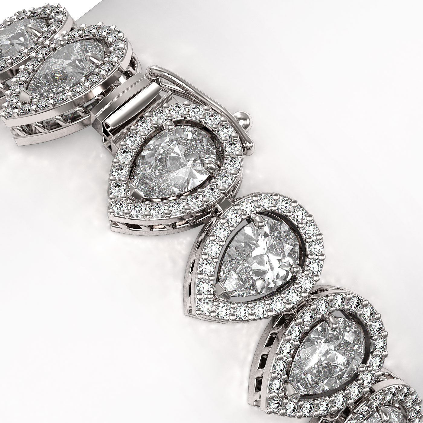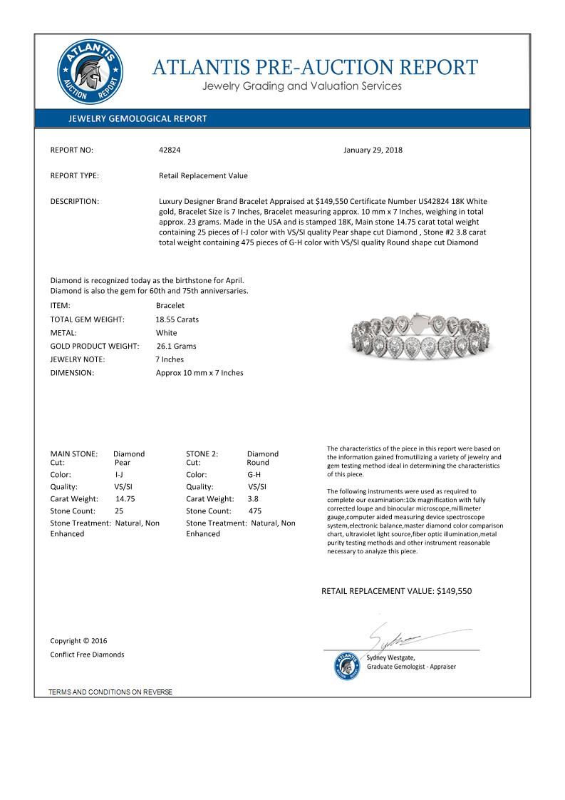 REF-3398W9F -42824 ---- 18.55 CTW Pear Diamond Designer Bracelet 18K White Gold ---- Luxury Designer Brand Bracelet Appraised at $149,550 Certificate Number US42824 18K White gold, Bracelet Size is 7 Inches, Bracelet measuring approx. 10 mm x 7 Inches, weighing in total approx. 23 grams. Made in the USA and is stamped 18K, Main stone 14.75 carat total weight containing 25 pieces of I-J color with VS/SI quality Pear shape cut Diamond , Stone #2 3.8 carat total weight containing 475 pieces of G-H color with VS/SI quality Round shape cut Diamond