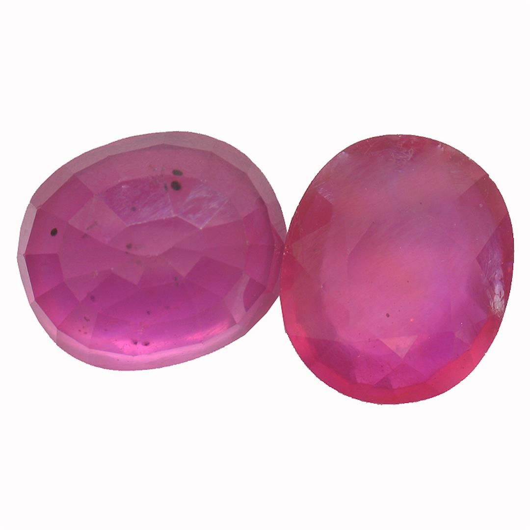 Two oval mixed cut natural rubies, measuring 13.00 x 11.00 x 5.00mm, exact total weight 18.57ct., clarity is heavily included, type II, dark, very slightly brownish, slightly purplish red color, (GIA slpR 7/3), cut is good. Transmitting light somewhat diffusely, translucent. Naturally occurring internal & external characteristics are present. Indications of laboratory high temperature heat treatment, with glass & flux additives. Ruby has a low tolerance to rhodium plating, repolishing the surface, & ultrasonic cleaning. Westfield Appraised at $2,170.00.