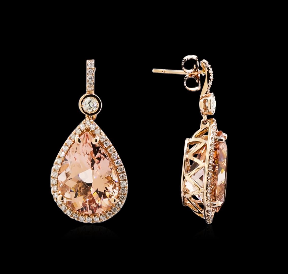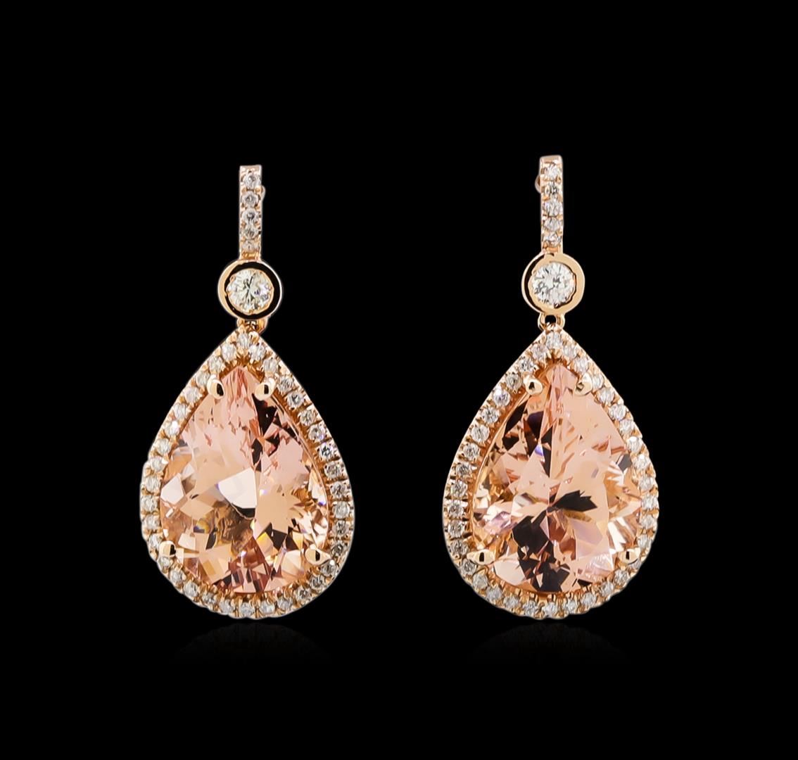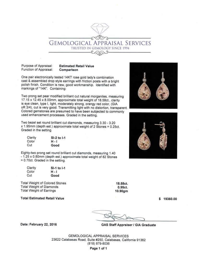 One pair electronically tested 14KT rose gold lady's combination cast & assembled drop style earrings with friction posts with a bright polish finish. Identified with markings of "14K". Condition is new, good workmanship. Containing: Two prong set pear modified brilliant cut natural morganites, measuring 17.15 x 12.45 x 8.00mm, approximate total weight of 18.58ct., clarity is eye clean, type I, light, moderately strong, orangy red color, (GIA oR 3/4), cut is very good. Transmitting light with no distortion, transparent. Colored gemstones are presumed to have been subjected to commonly used enhancement processes. Graded in the setting. Two bezel set round brilliant cut diamonds, measuring 3.30 - 3.20 x 1.95mm (depth est.) approximate total weight of 2 Stones = 0.25ct. Graded in the setting. Clarity: SI-2 to I-1. Color: H - I. Cut Good Eighty-Two prong set round brilliant cut diamonds, measuring 1.40 - 1.25 x 0.80mm (depth est.) approximate total weight of 82 Stones = 0.70ct. Graded in the setting. Clarity: SI-1 to I-1. Color: H - I. Cut Good. Total Weight of Colored Stones 18.58ct. Total Weight of Diamonds 0.95ct. Total Weight of Earrings 10.90gm. GAS Appraised at $19,360.00.