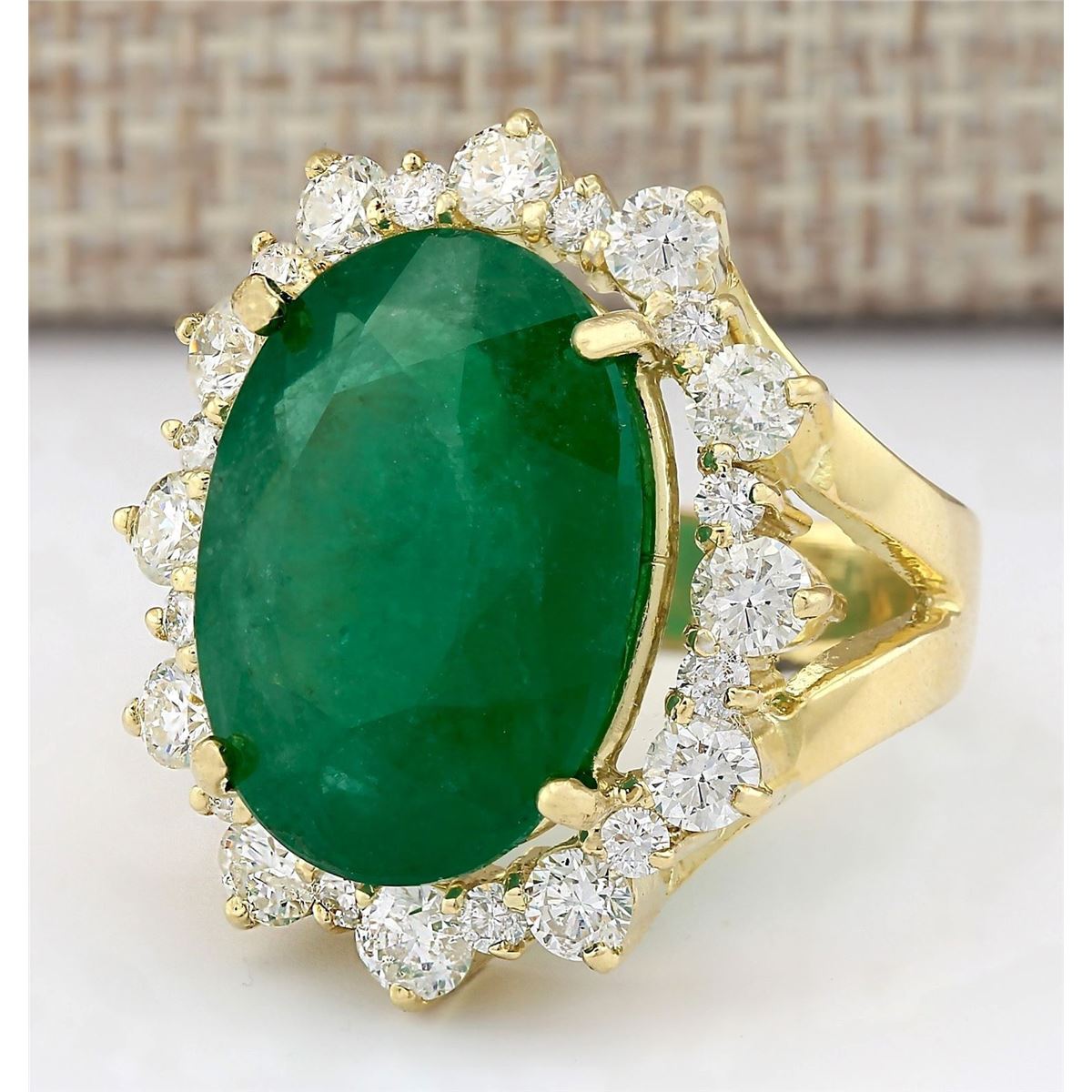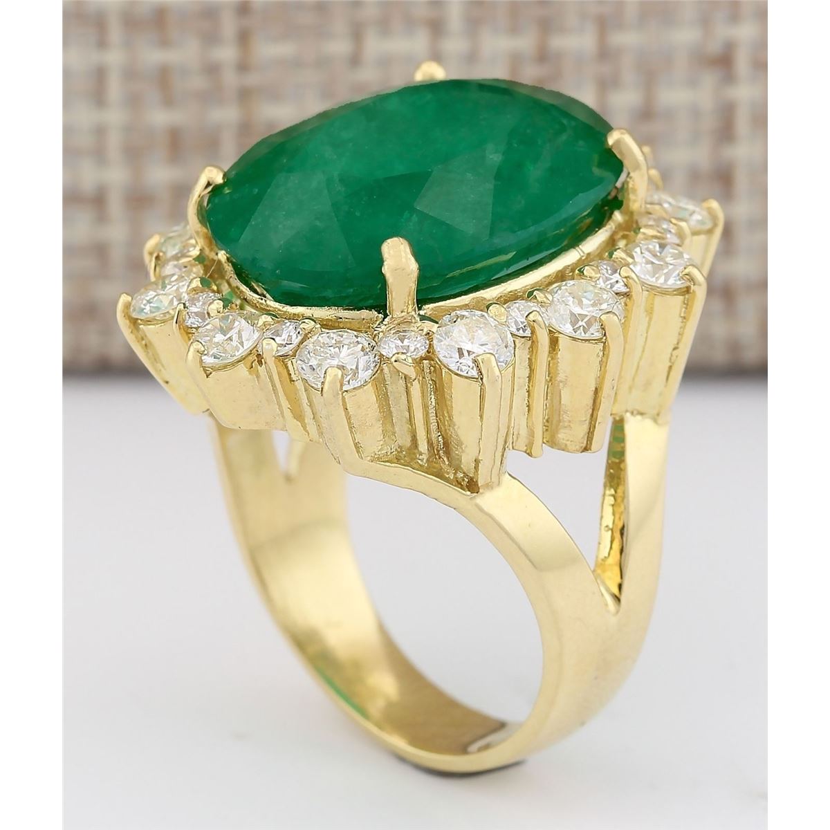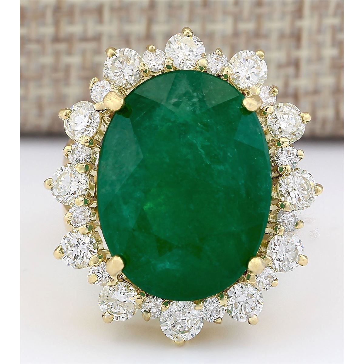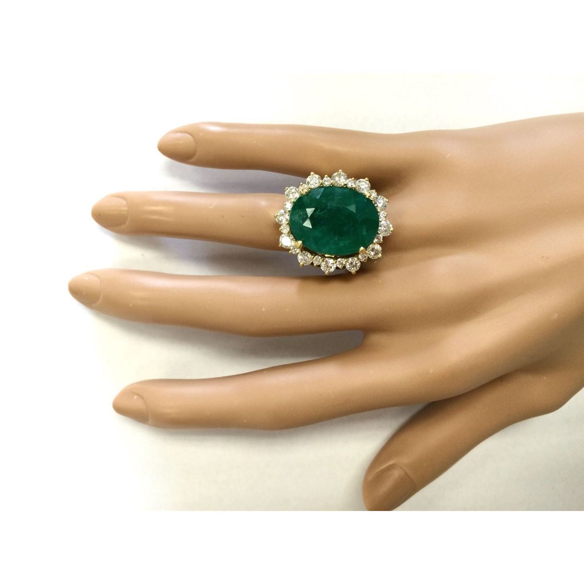 Stamped: 14K Ring Size: 7.5 Total Ring Weight: 15.8 Grams Diamond Weight: Total natural diamond weight is 2.75carat. SI1-SI2 clarity / G-H color Gemstone Weight: Total Natural Emerald Weight is 15.84ctw (Measures: 19.20x14.53mm) Main Stone Color: Green Face Measures: 26.45x23.30mm SKU: [703611]