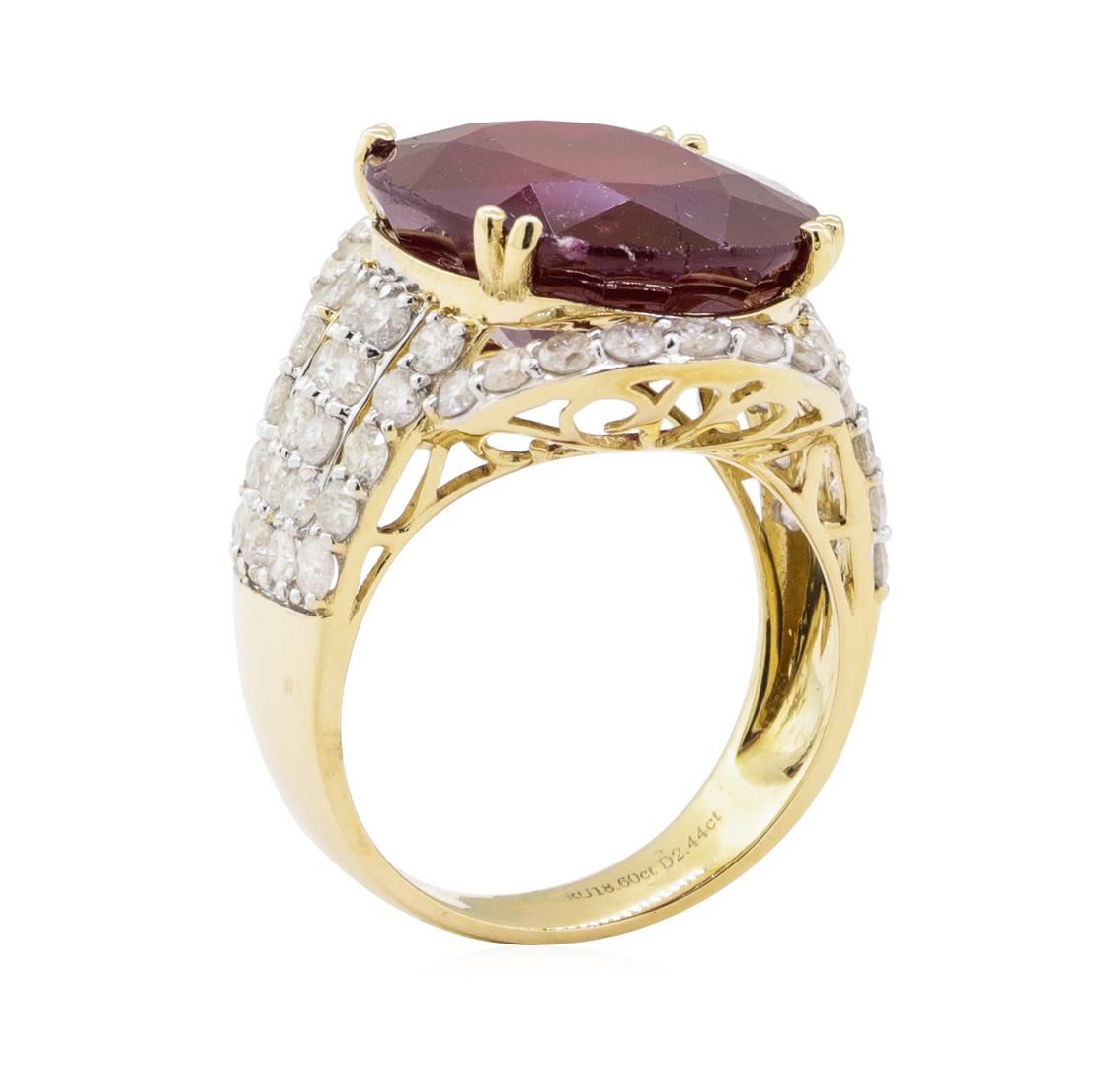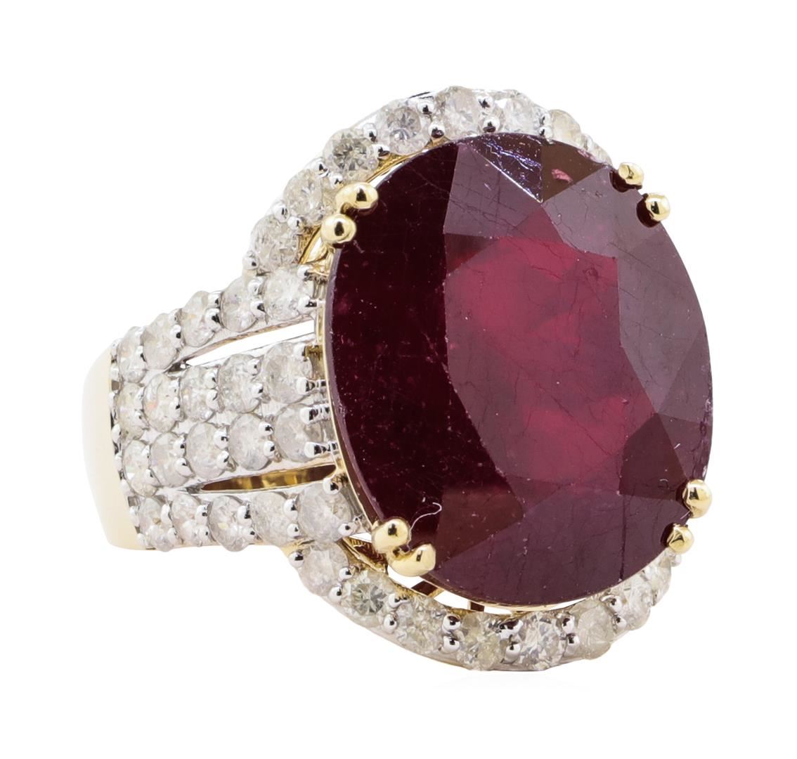 One electronically tested 14KT yellow gold ladies cast ruby & diamond ring. The featured ruby is set within a diamond bezel supported by an elaborate lattice under gallery and diamond set shoulders, completed by a four and one-half millimeter wide band. Bright polish finish with rhodium accents. Trademark is Orianne. Identified with markings of "14K". Condition is new, good workmanship. Containing: One prong set oval cut natural ruby, measuring 17.50 x 14.80 x 8.00mm, approximate weight of 18.60ct., clarity is heavily included, type II, medium dark, moderately strong, slightly purplish red color, (GIA slpR 6/4), cut is good. Transmitting light somewhat diffusely, transparent to translucent. Naturally occurring internal & external characteristics are present. Indications of laboratory high temperature heat treatment, with glass & flux additives. Graded in the setting. Ruby has a low tolerance to rhodium plating, repolishing the surface, & ultrasonic cleaning. Fifty-Eight prong set round brilliant cut diamonds, measuring 2.20 - 2.10 x 1.29mm (depth est.) approximate total weight of 58 Stones = 2.44ct. Graded in the setting. Clarity I-1 to I-2 Color F - H Total Weight of Colored Stones 18.60 ct. Total Weight of Diamonds 2.44 ct. Total Weight of Ring 10.50 gm Estimated Retail Value $ 8,850.00 US