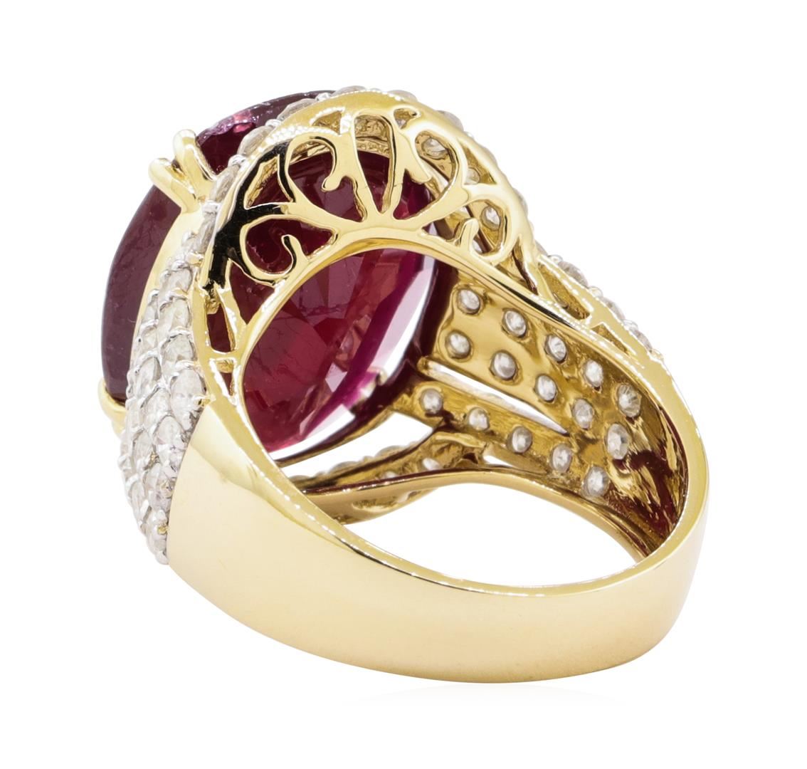 One electronically tested 14KT yellow gold ladies cast ruby & diamond ring. The featured ruby is set within a diamond bezel supported by an elaborate lattice under gallery and diamond set shoulders, completed by a four and one-half millimeter wide band. Bright polish finish with rhodium accents. Trademark is Orianne. Identified with markings of "14K". Condition is new, good workmanship. Containing: One prong set oval cut natural ruby, measuring 17.50 x 14.80 x 8.00mm, approximate weight of 18.60ct., clarity is heavily included, type II, medium dark, moderately strong, slightly purplish red color, (GIA slpR 6/4), cut is good. Transmitting light somewhat diffusely, transparent to translucent. Naturally occurring internal & external characteristics are present. Indications of laboratory high temperature heat treatment, with glass & flux additives. Graded in the setting. Ruby has a low tolerance to rhodium plating, repolishing the surface, & ultrasonic cleaning. Fifty-Eight prong set round brilliant cut diamonds, measuring 2.20 - 2.10 x 1.29mm (depth est.) approximate total weight of 58 Stones = 2.44ct. Graded in the setting. Clarity I-1 to I-2 Color F - H Total Weight of Colored Stones 18.60 ct. Total Weight of Diamonds 2.44 ct. Total Weight of Ring 10.50 gm Estimated Retail Value $ 8,850.00 US