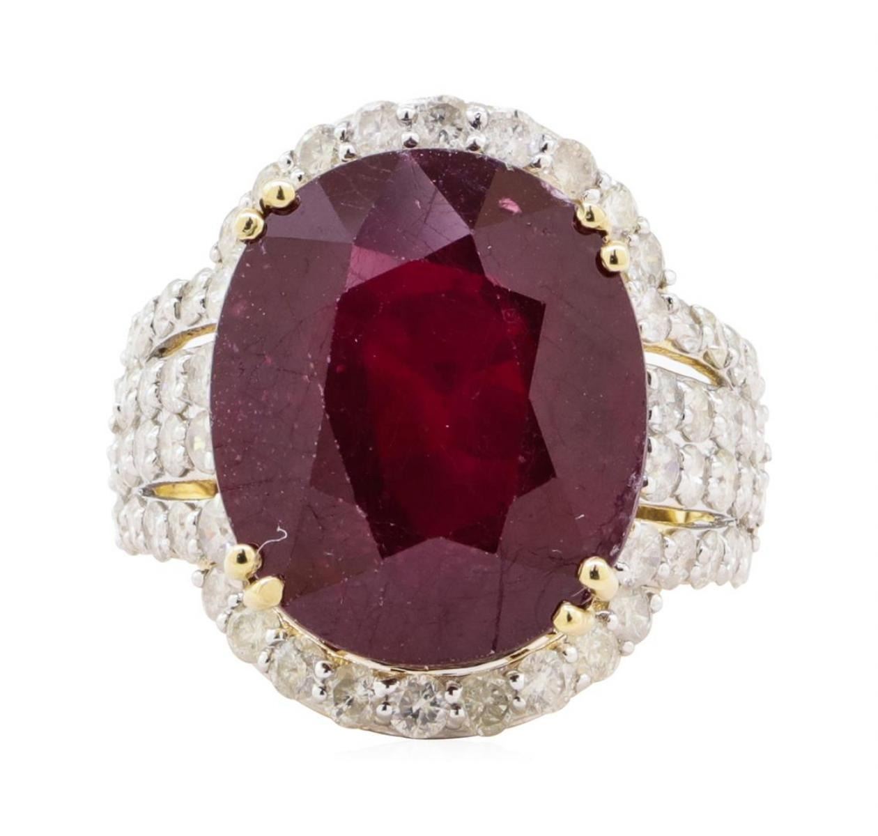 One electronically tested 14KT yellow gold ladies cast ruby & diamond ring. The featured ruby is set within a diamond bezel supported by an elaborate lattice under gallery and diamond set shoulders, completed by a four and one-half millimeter wide band. Bright polish finish with rhodium accents. Trademark is Orianne. Identified with markings of "14K". Condition is new, good workmanship. Containing: One prong set oval cut natural ruby, measuring 17.50 x 14.80 x 8.00mm, approximate weight of 18.60ct., clarity is heavily included, type II, medium dark, moderately strong, slightly purplish red color, (GIA slpR 6/4), cut is good. Transmitting light somewhat diffusely, transparent to translucent. Naturally occurring internal & external characteristics are present. Indications of laboratory high temperature heat treatment, with glass & flux additives. Graded in the setting. Ruby has a low tolerance to rhodium plating, repolishing the surface, & ultrasonic cleaning. Fifty-Eight prong set round brilliant cut diamonds, measuring 2.20 - 2.10 x 1.29mm (depth est.) approximate total weight of 58 Stones = 2.44ct. Graded in the setting. Clarity I-1 to I-2 Color F - H Total Weight of Colored Stones 18.60 ct. Total Weight of Diamonds 2.44 ct. Total Weight of Ring 10.50 gm Estimated Retail Value $ 8,850.00 US