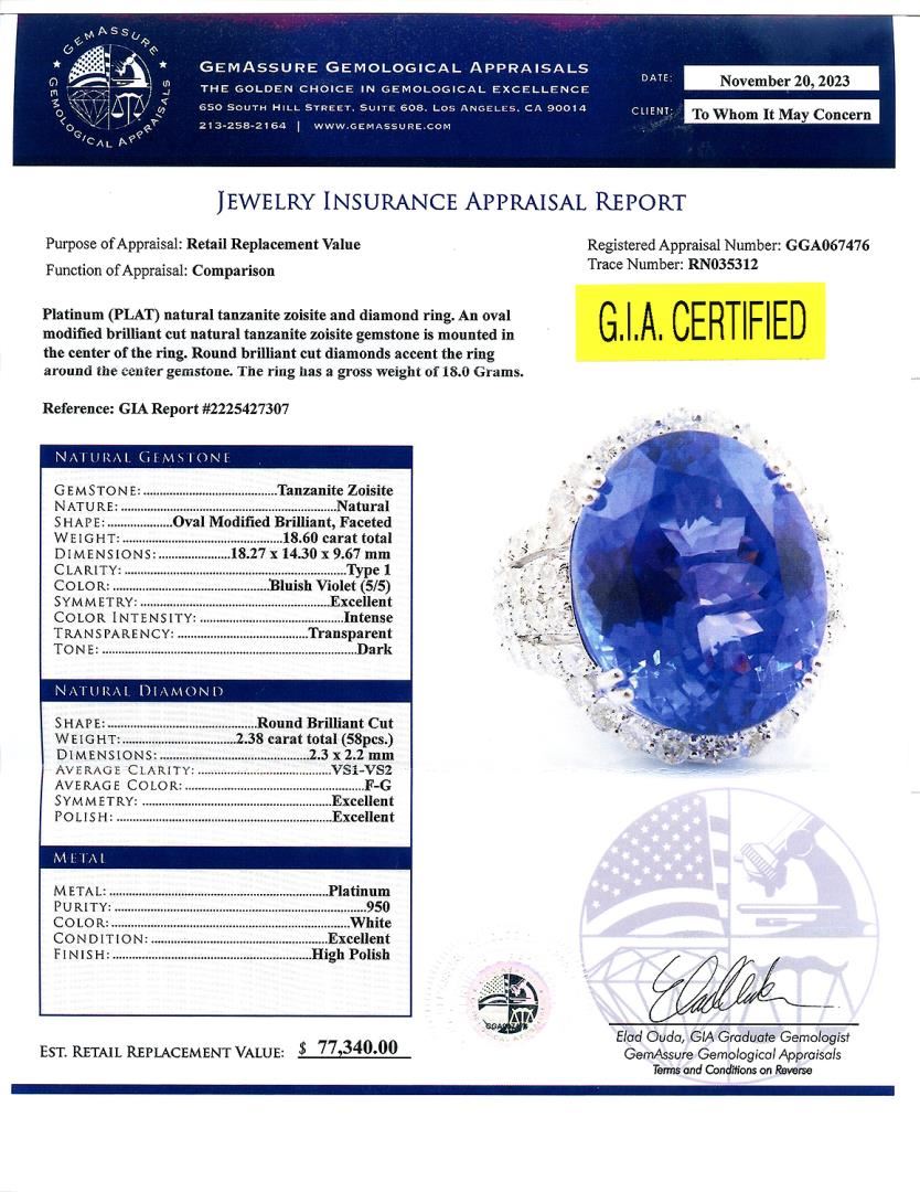 Platinum (PLAT) natural tanzanite zoisite and diamond ring. An oval modified brilliant cut natural tanzanite zoisite gemstone is mounted in the center of the ring. Round brilliant cut diamonds accent the ring around the cenier gemstone. The ring hia a gross weight of 18.0 Grams. Reference: GIA Report #2225427307 #NATURAL GEMSTONE# GEMSTONE: Tanzanite Zoisite; NATURE: Natural; SHAPE: Oval Modified Brilliant, Faceted; WEIGHT: 18.60 carat total; DIMENSIONS: 18.27 X 14.30 x 9.67mm; CLARITY: Type 1; COLOR: Bluish Violet (5/5); SYMMETRY: Excellent; COLOR INTENSITY: Intense; TRANSPARENCY: Transparent; TONE: Dark #NATURAL DIAMOND# SHAPE: Round Brilliant Cut; WEIGHT: 2.38 carat total (58pcs.); DIMENSIONS: 2.3 x 2.2mm; AVERAGE CLARITY: VS1-VS2; AVERAGE COLOR: F-G; SYMMETRY: Excellent; POLISH: Excellent #METAL# METAL: Platinum; PURITY: 950; COLOR: White; CONDITION: Excellent; FINISH: High Polish #Size: 7