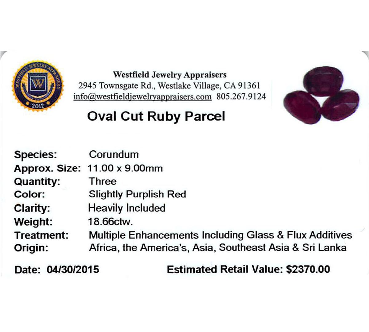Three oval mixed cut natural rubies exact total weight 18.66ct., clarity is heavily included, type II, dark, very slightly brownish, slightly purplish red color, (GIA slpR 7/3), cut is good. Westfield Appraised at $2,370.00.
