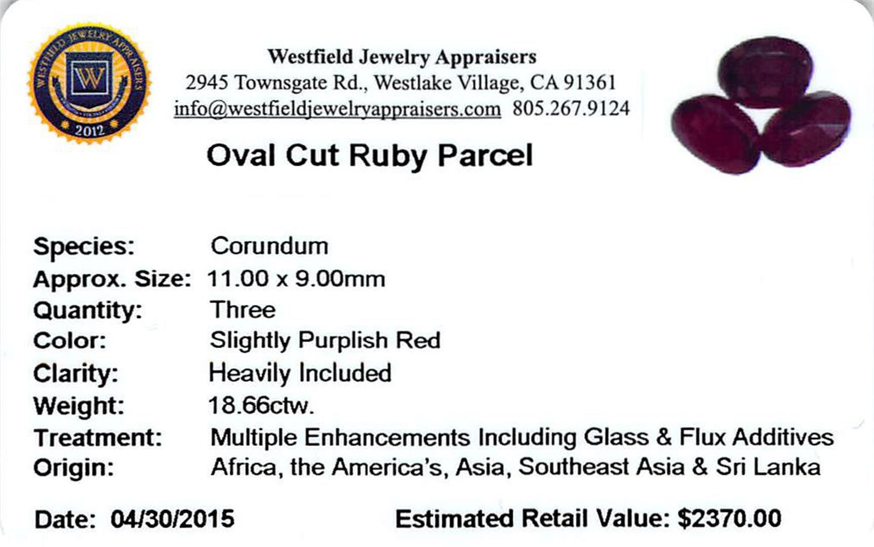 Three oval mixed cut natural rubies exact total weight 18.66ct., clarity is heavily included, type II, dark, very slightly brownish, slightly purplish red color, (GIA slpR 7/3), cut is good. Westfield Appraised at $2,370.00.