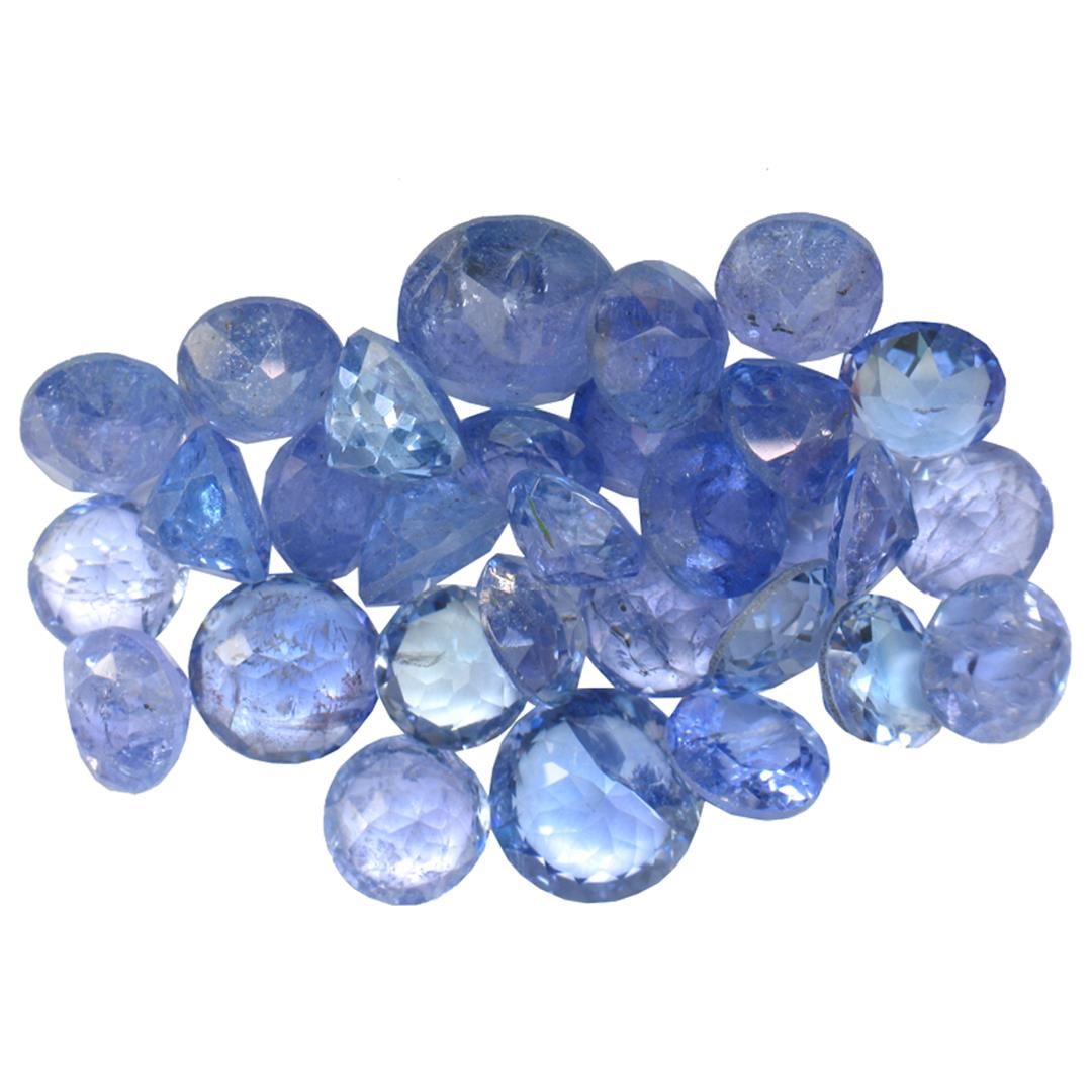Thirty-one round mixed cut natural tanzanites, measuring 6.00 - 6.00 x 3.00 mm, exact total weight 18.66ct., clarity is slightly included, type I, medium dark, very slightly grayish, violetish blue color, (GIA vB 6/3), cut is good. Measurements & the color grade are an average for the group, Color grade is an average for the group, Transmitting light with no distortion, transparent, Naturally occurring internal & external characteristics are present, Indications of multiple laboratory enhancements, including high temperature heat treatment. Westfield Appraised at $1,795.00.