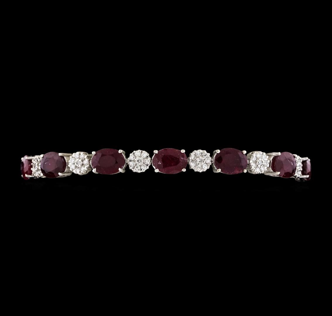 One electronically tested 14KT white gold lady's combination cast & assembled fashion bracelet with a tongue clasp with foldover safety with a bright polish finish. The featured lady's bracelet has alternating diamond cluster links and ruby links and measures approximately 7 inches in length. Identified with markings of '14K'. Condition is new, good workmanship. Containing: Thirteen prong set oval modified mixed cut natural rubies, measuring 8.00 x 6.05 x 3.20mm, (depth est.) 10%. bulge factor, approximate total weight of 18.68ct., clarity is severely included, medium dark, very slightly brownish, red color, (GIA R 6/3), cut is good. Transmitting light somewhat diffusely, semi-transparent to translucent. Naturally occurring internal & external characteristics are present. Indications of laboratory high temperature heat treatment, with glass & flux additives. Colored gemstones are presumed to have been subjected to commonly used enhancement processes. Graded in the setting. One Hundred Four prong set round brilliant cut diamonds, measuring 1.50 - 1.40 x 0.87mm (depth est.) approximate total weight of 104 Stones = 1.16ct. Graded in the setting. Clarity SI-1 to I-1. Color: H - I Cut Good. Total Weight of Colored Stones 18.68ct.. Total Weight of Diamonds 1.16ct.. Total Weight of Bracelet 15.00gm. GAS Appraised at $6,340.00.