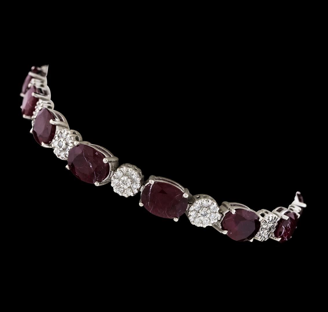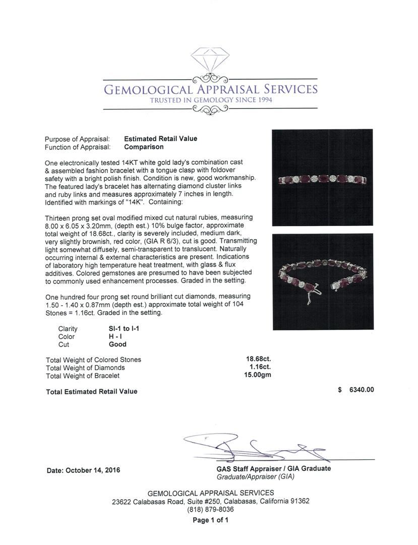 One electronically tested 14KT white gold lady's combination cast & assembled fashion bracelet with a tongue clasp with foldover safety with a bright polish finish. The featured lady's bracelet has alternating diamond cluster links and ruby links and measures approximately 7 inches in length. Identified with markings of '14K'. Condition is new, good workmanship. Containing: Thirteen prong set oval modified mixed cut natural rubies, measuring 8.00 x 6.05 x 3.20mm, (depth est.) 10%. bulge factor, approximate total weight of 18.68ct., clarity is severely included, medium dark, very slightly brownish, red color, (GIA R 6/3), cut is good. Transmitting light somewhat diffusely, semi-transparent to translucent. Naturally occurring internal & external characteristics are present. Indications of laboratory high temperature heat treatment, with glass & flux additives. Colored gemstones are presumed to have been subjected to commonly used enhancement processes. Graded in the setting. One Hundred Four prong set round brilliant cut diamonds, measuring 1.50 - 1.40 x 0.87mm (depth est.) approximate total weight of 104 Stones = 1.16ct. Graded in the setting. Clarity SI-1 to I-1. Color: H - I Cut Good. Total Weight of Colored Stones 18.68ct.. Total Weight of Diamonds 1.16ct.. Total Weight of Bracelet 15.00gm. GAS Appraised at $6,340.00.