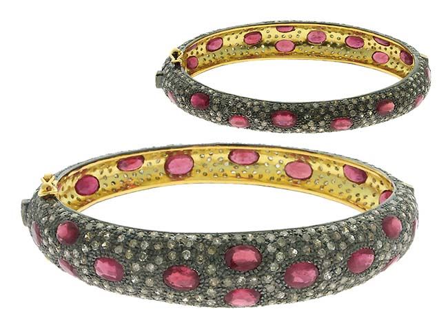 RUBY AND DIAMOND BANGLE/**/Diamond 1 CTW:6.72/Diamond Color & Clarity:J-L/I1-I2(Single Cut)/Diamond Count 2:/Diamond 2 CTW:/Diamond Color & Clarity:/Gemstone Count1:/Gemstone 1 CTW:12/Gemstone Count 2:/Gemstone 2 CTW:/Metal Type 1 Gold:14k Yellow Gold /Gold Gram Weight:3.53/Metal Type 2:over 0.925 Sterling Silver/Silver Gram Weight:16.73/Gross Weight: 24.01