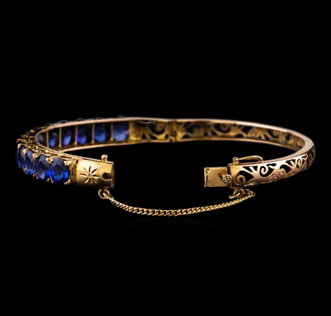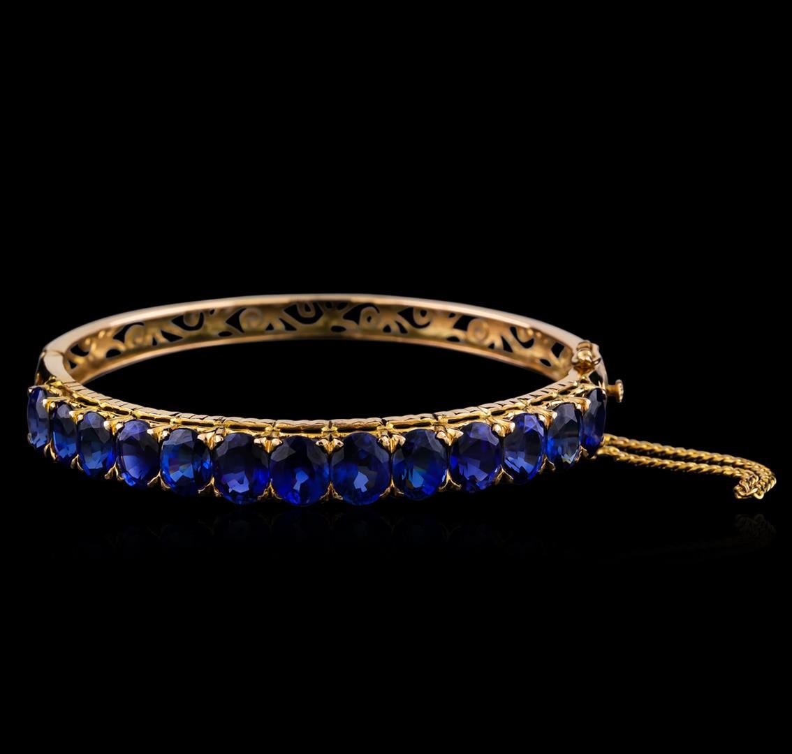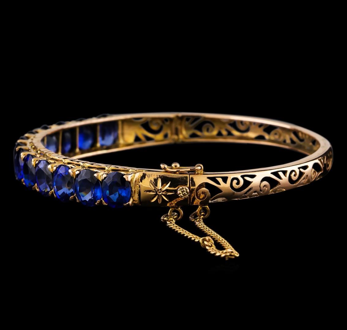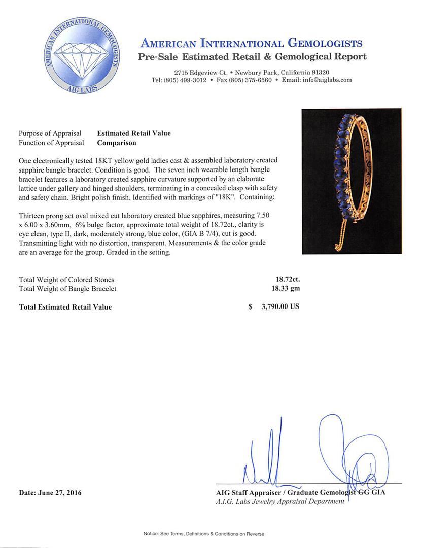 One electronically tested 18KT yellow gold ladies cast & assembled laboratory created sapphire bangle bracelet. The seven inch wearable length bangle bracelet features a laboratory created sapphire curvature supported by an elaborate lattice under gallery and hinged shoulders, terminating in a concealed clasp with safety and safety chain. Bright polish finish. Identified with markings of "18K". Condition is good. Containing: Thirteen prong set oval mixed cut laboratory created blue sapphires, measuring 7.50 x 6.00 x 3.60mm, 6%. bulge factor, approximate total weight of 18.72ct., clarity is eye clean, type II, dark, moderately strong, blue color, (GIA B 7/4), cut is good. Transmitting light with no distortion, transparent. Measurements & the color grade are an average for the group. Graded in the setting. Total Weight of Colored Stones 18.72ct. Total Weight of Bangle Bracelet 18.33gm. AIG Appraised at $3,790.00.