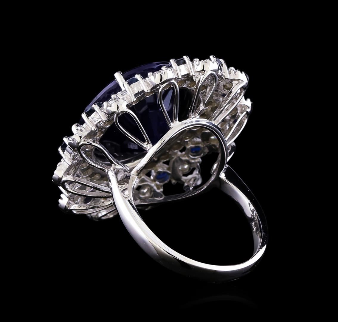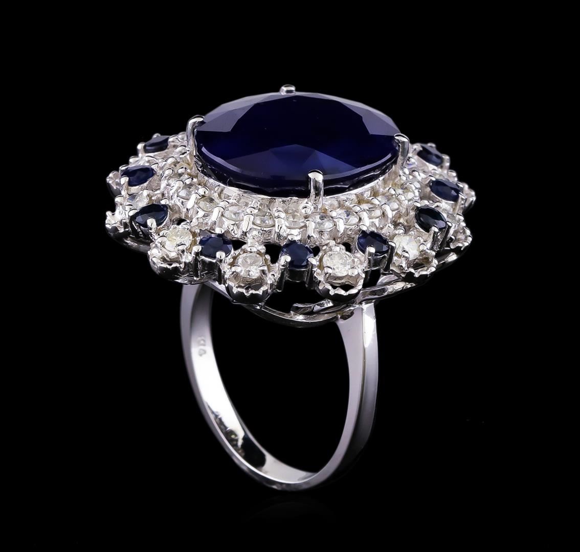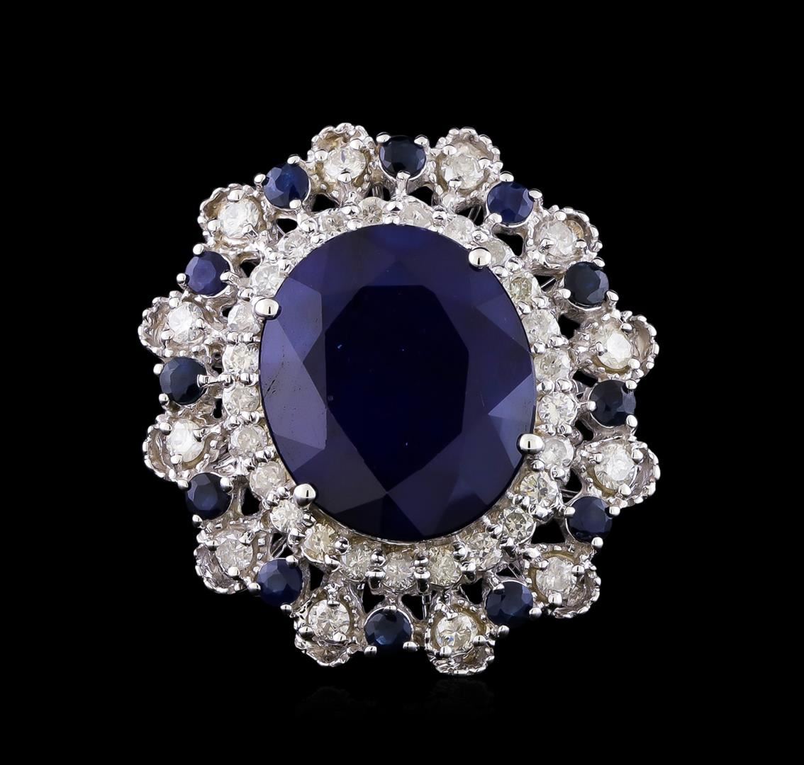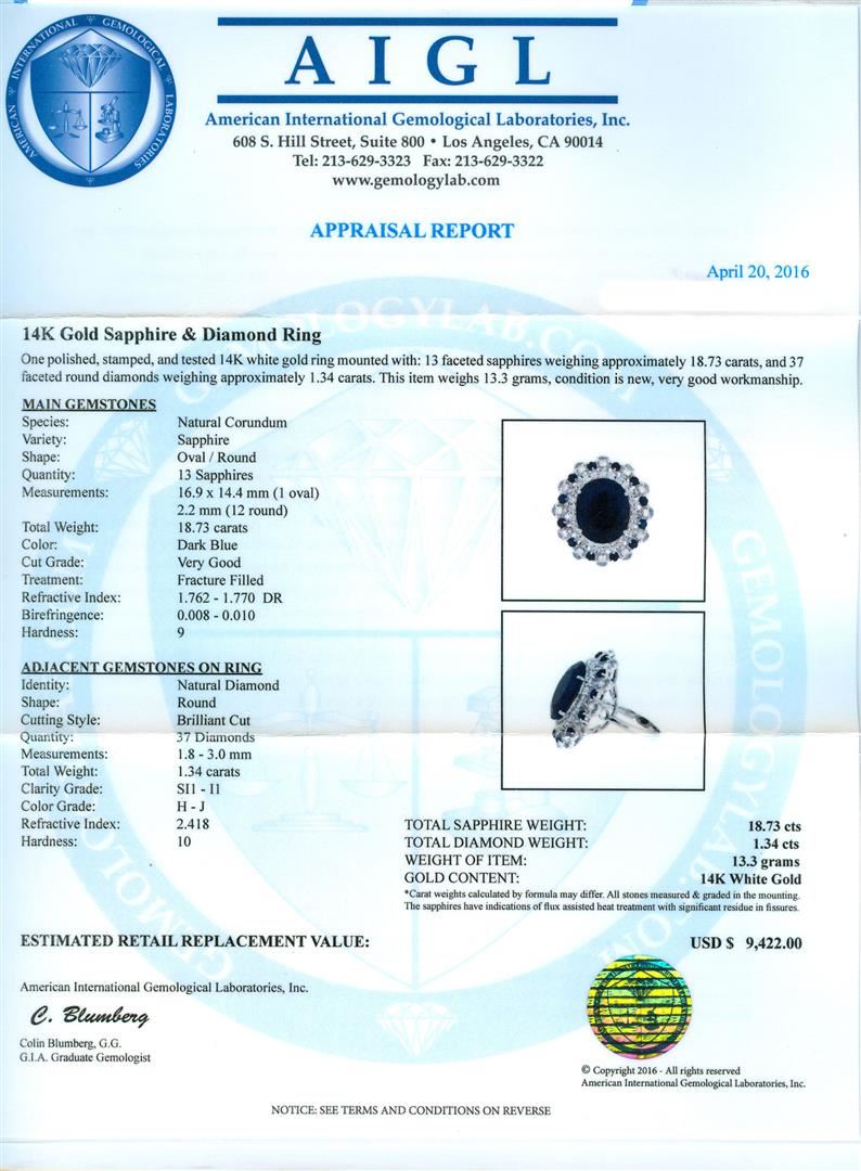 14K Gold Sapphire & Diamond Ring. One Polished, stamped, and tested 14K white gold ring mounted with: 13 faceted sapphires weighing approximately 18.73 carats, and 37 faceted round diamonds, weighing approximately 1.34 carats. This item weighs 13.3 grams, condition is new, very good workmanship. Main Gemstones: Species: Natural Corundum. Variety: Sapphire. Shape: Oval/round. Quantity: 13 Sapphires. Measurements: 16.9 x 14.4 mm ( 1 oval ). 2.2 mm ( 12 round ). 18.73 carats. Color: Dark blue. Cut grade: Very Good. Treatment: Fracture filled. Refractive index: 1.762-1.770 DR. Birefringence: 0.008-0.010. Hardness: 9. Adjacent gemstones on Ring: Identity: Natural diamond. Shape: Round. Cutting style: Brilliant cut. Quantity: 37 Diamonds. Measurements: 1.8-3.0 mm. Total weight: 1.34 carats. Clarity grade: SI1-I1. Color grade: H-J. Refractive index: 2.418. Hardness: 10. Gold content: 14K white gold. AIGL Appraised at $9,422.00.