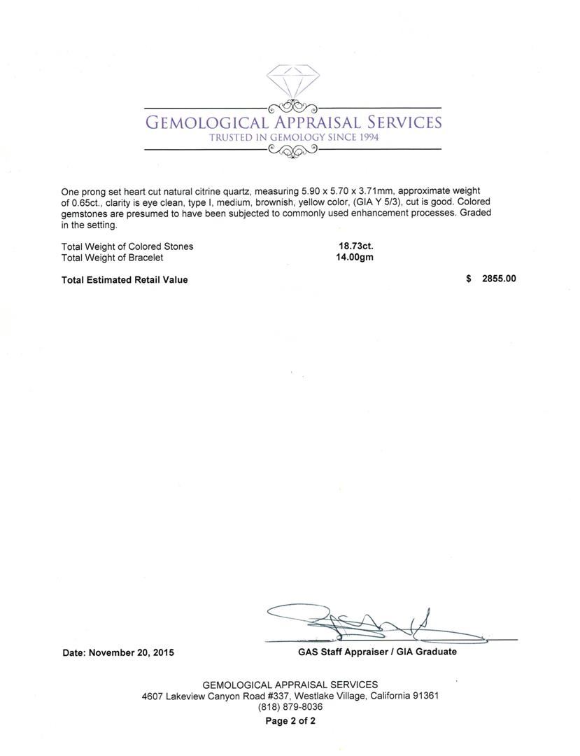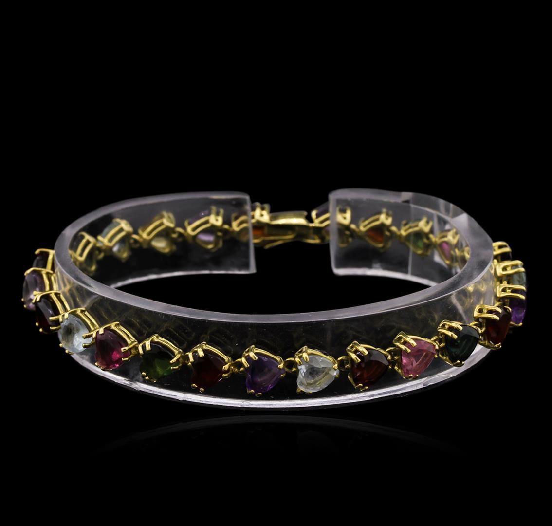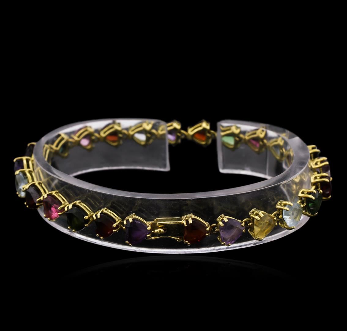 One electronically tested 18KT yellow gold lady's combination cast & assembled tennis bracelet with a tongue clasp with foldover safety with a bright polish finish. The featured lady's bracelet measures approximately 7.25 inches in length. Identified with markings of "750". Condition is used, good workmanship. Containing: Eight prong set heart cut natural pyrope garnets, measuring 5.90 x 5.70 x 3.71mm, approximate total weight of 7.28ct., clarity is eye clean, type II, medium dark, very slightly brownish, red color, (GIA R 6/3), cut is good. Colored gemstones are presumed to have been subjected to commonly used enhancement processes. Graded in the setting. Five prong set heart cut natural amethysts, measuring 5.90 x 5.70 x 3.71mm, approximate total weight of 3.25ct., clarity is eye clean, type II, medium light, very slightly grayish, purple color, (GIA P 4/3), cut is good. Colored gemstones are presumed to have been subjected to commonly used enhancement processes. Graded in the setting. Four prong set heart cut natural aquamarines, measuring 5.90 x 5.70 x 3.71mm, approximate total weight of 2.64ct., clarity is eye clean, type I, light, very slightly grayish, blue color, (GIA B 3/3), cut is good. Colored gemstones are presumed to have been subjected to commonly used enhancement processes. Graded in the setting. Four prong set heart cut natural green tourmalines, measuring 5.90 x 5.70 x 3.71mm, approximate total weight of 2.96ct., clarity is eye clean, type I, medium, very slightly grayish, slightly yellowish green color, (GIA slyG 5/3), cut is good. Colored gemstones are presumed to have been subjected to commonly used enhancement processes. Graded in the setting. Three prong set heart cut natural pink quartzes, measuring 5.90 x 5.70 x 3.71mm, approximate total weight of 1.95ct., clarity is eye clean, medium, very slightly grayish, pink color, (GIA Pk 5/3), cut is good. Colored gemstones are presumed to have been subjected to commonly used enhancement processes. Graded in the setting. One prong set heart cut natural citrine quartz, measuring 5.90 x 5.70 x 3.71mm, approximate weight of 0.65ct., clarity is eye clean, type I, medium, brownish, yellow color, (GIA Y 5/3), cut is good. Colored gemstones are presumed to have been subjected to commonly used enhancement processes. Graded in the setting. Total Weight of Colored Stones 18.73ct. Total Weight of Bracelet 14.00gm. GAS Appraised at $2,855.00.
