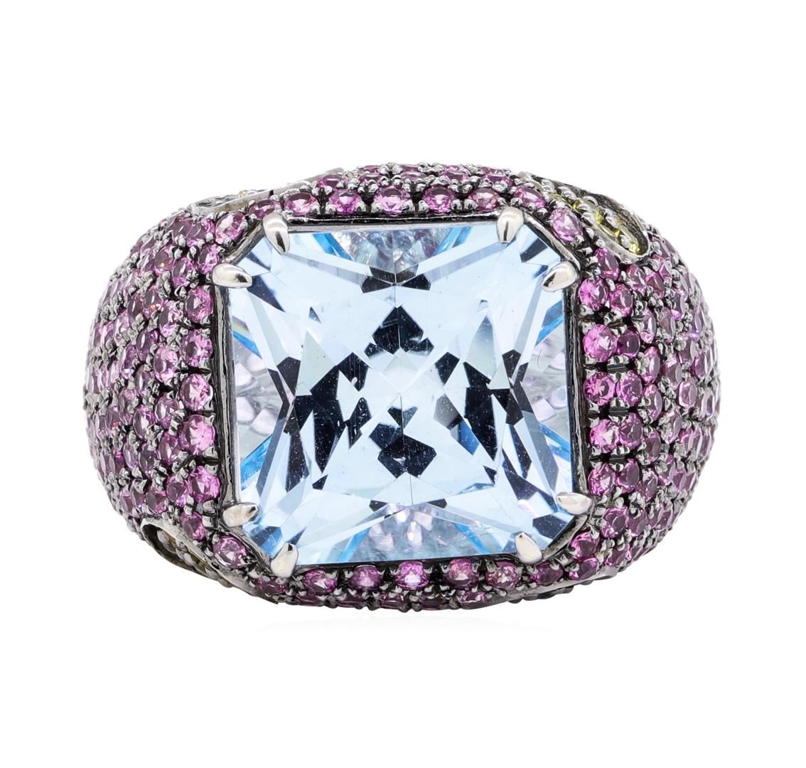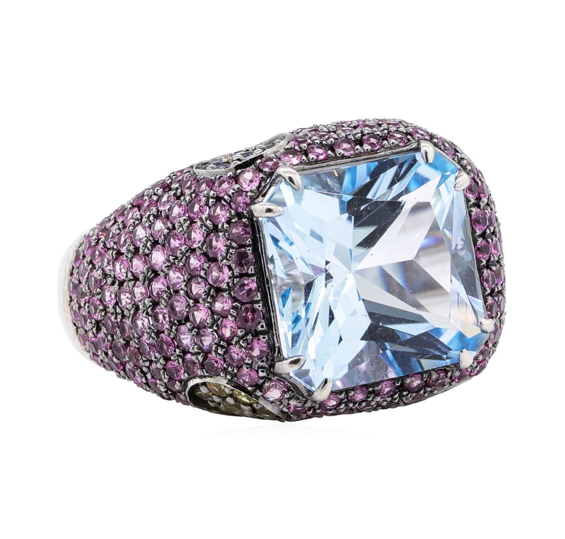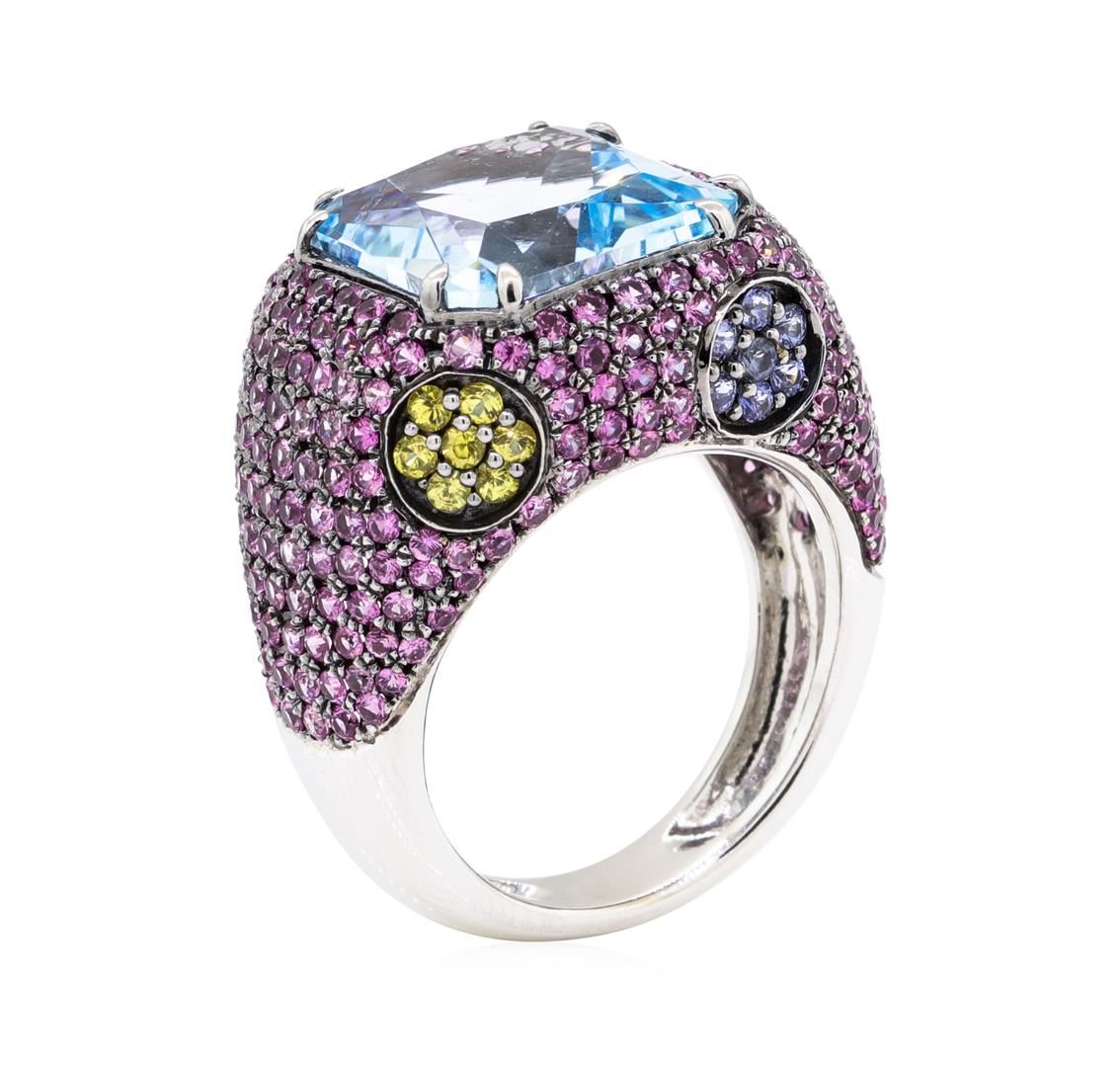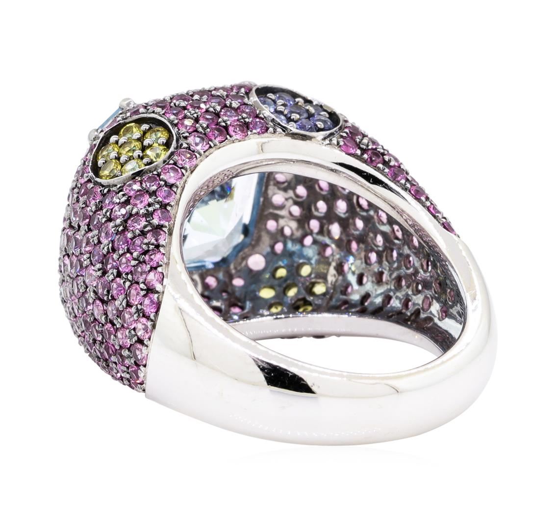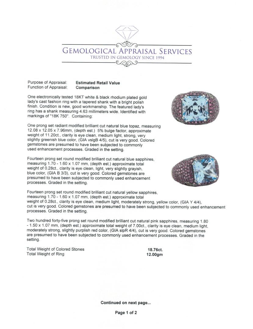 One electronically tested 18KT white & black rhodium plated gold lady's cast fashion ring with a tapered shank with a bright polish finish. The featured lady's ring has a shank measuring 4.63 millimeters wide. Identified with markings of '18K 750'. Condition is new, good workmanship. Containing: One prong set radiant modified brilliant cut natural blue topaz, measuring 12.08 x 12.05 x 7.96mm, (depth est.) 5%. bulge factor, approximate weight of 11.20ct., clarity is eye clean, medium light, strong, very slightly greenish blue color, (GIA vslgB 4/5), cut is very good. Colored gemstones are presumed to have been subjected to commonly used enhancement processes. Graded in the setting. Fourteen prong set round modified brilliant cut natural blue sapphires, measuring 1.70 - 1.60 x 1.07 mm, (depth est.) approximate total weight of 0.28ct., clarity is eye clean, light, very slightly grayish, blue color, (GIA B 3/3), cut is very good. Colored gemstones are presumed to have been subjected to commonly used enhancement processes. Graded in the setting. Fourteen prong set round modified brilliant cut natural yellow sapphires, measuring 1.70 - 1.60 x 1.07 mm, (depth est.) approximate total weight of 0.28ct., clarity is eye clean, medium light, moderately strong, yellow color, (GIA Y 4/4), cut is very good. Colored gemstones are presumed to have been subjected to commonly used enhancement processes. Graded in the setting. Two hundred forty-five prong set round modified brilliant cut natural pink sapphires, measuring 1.80 - 1.50 x 1.07 mm, (depth est.) approximate total weight of 7.00ct., clarity is eye clean, medium light, moderately strong, slightly purplish red color, (GIA slpR 4/4), cut is very good. Colored gemstones are presumed to have been subjected to commonly used enhancement processes. Graded in the setting. Total Weight of Colored Stones 18.76ct.. Total Weight of Ring 12.00gm GAS Appraised at $8130.00. GAS Appraised.