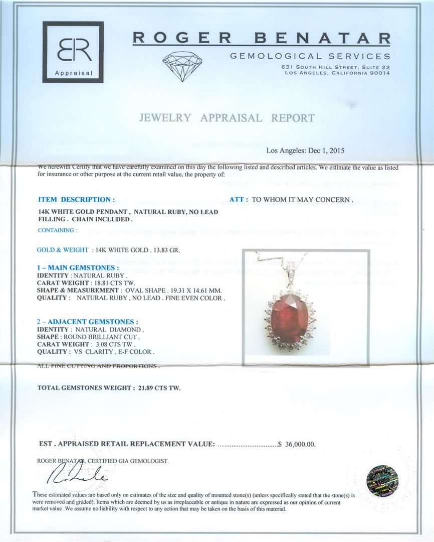 One 14KT White Gold Pendant, Natural Ruby, No Lead Filling, Chain Included. Containing: Gold & Metal Weight: 14KT White Gold, 13.83 grams. Main Gemstones: Identity: Natural Ruby. Carat Weight: 18.81 cts tw. Shape & Measurement: Oval Shape. 19.31 x 14.61 mm. Quality: Natural Ruby, No Lead, Fine Even Color. Adjacent Gemstones: Identity: Natural Diamond. Shape: Round Brilliant Cut. Carat Weight: 3.08 cts tw. Quality: VS Clarity, E-F Color. All fine cutting and proportions. Total Gemstones Weight: 21.89 cts tw. RBGS Appraised at $36,000.00.