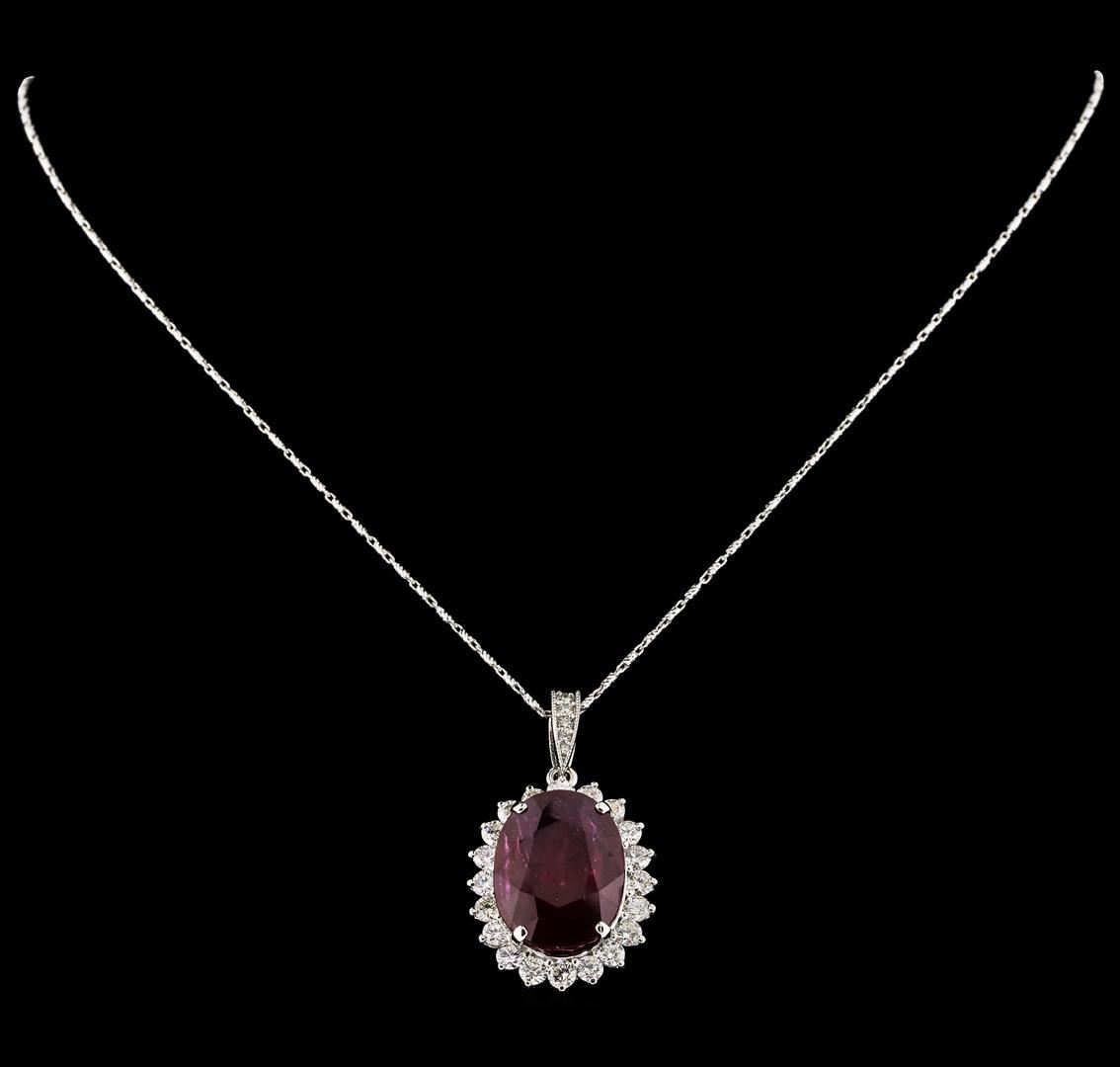 One 14KT White Gold Pendant, Natural Ruby, No Lead Filling, Chain Included. Containing: Gold & Metal Weight: 14KT White Gold, 13.83 grams. Main Gemstones: Identity: Natural Ruby. Carat Weight: 18.81 cts tw. Shape & Measurement: Oval Shape. 19.31 x 14.61 mm. Quality: Natural Ruby, No Lead, Fine Even Color. Adjacent Gemstones: Identity: Natural Diamond. Shape: Round Brilliant Cut. Carat Weight: 3.08 cts tw. Quality: VS Clarity, E-F Color. All fine cutting and proportions. Total Gemstones Weight: 21.89 cts tw. RBGS Appraised.