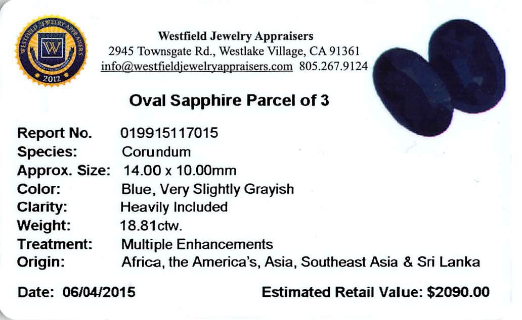 Three oval mixed cut natural blue sapphires, measuring 14.50 x 10.00 x 4.80mm, exact total weight 18.81ct., clarity is heavily included, type II, very dark, very slightly grayish, blue color, (GIA B 8/3), cut is good. Measurements are an average for the group. Transmitting light very diffusely, opaque, Naturally occurring internal & external characteristics are present, Indications of multiple laboratory enhancements, including high temperature heat treatment. Westfield Appraised at $2,090.00.