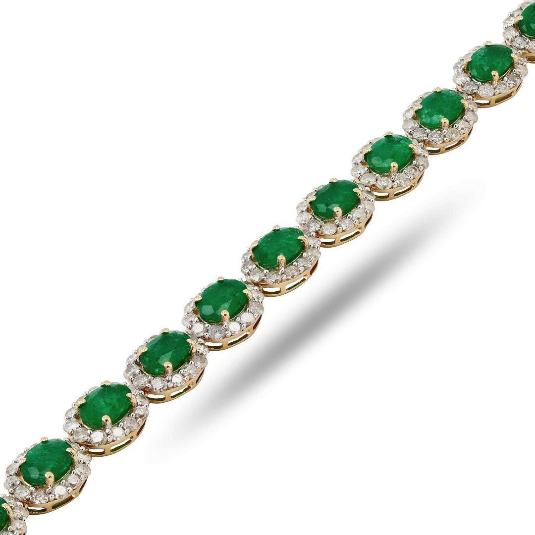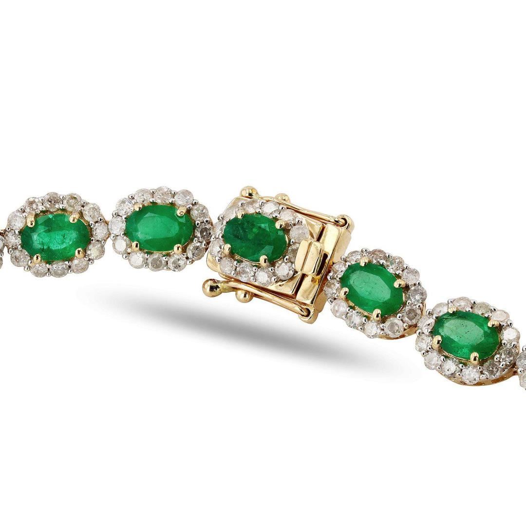 One electronically tested 14KT yellow gold ladies cast & assembled emerald and diamond necklace Seventeen and one-quarter inch length necklace features a flexible emerald and diamond bezel ribbon, terminating in a concealed clasp with twin safeties. Bright polish finish with rhodium accents. Trademark is Orianne. Identified with markings of "14K". Condition is new, good workmanship. Containing: Forty-five prong set oval mixed cut natural emeralds approximate total weight of 18.82ctw., clarity is heavily included, type III, medium dark, moderately strong, green color, (GIA G 6/4), cut is good. Transmitting light somewhat diffusely, transparent to translucent. Naturally occurring internal & external characteristics are present. Color grade is an average for the group. Indications of oil residue. Graded in the setting. Five Hundred Forty prong set round brilliant cut diamonds approximate total weight of 540 Stones = 10.47ctw. Graded in the setting. Clarity I2 to I3 Color E - G Total Weight of Colored Stones 18.82ctw. Total Weight of Diamonds 10.47ctw. Total Weight of Necklace 29.91 gm #LREF-11891
