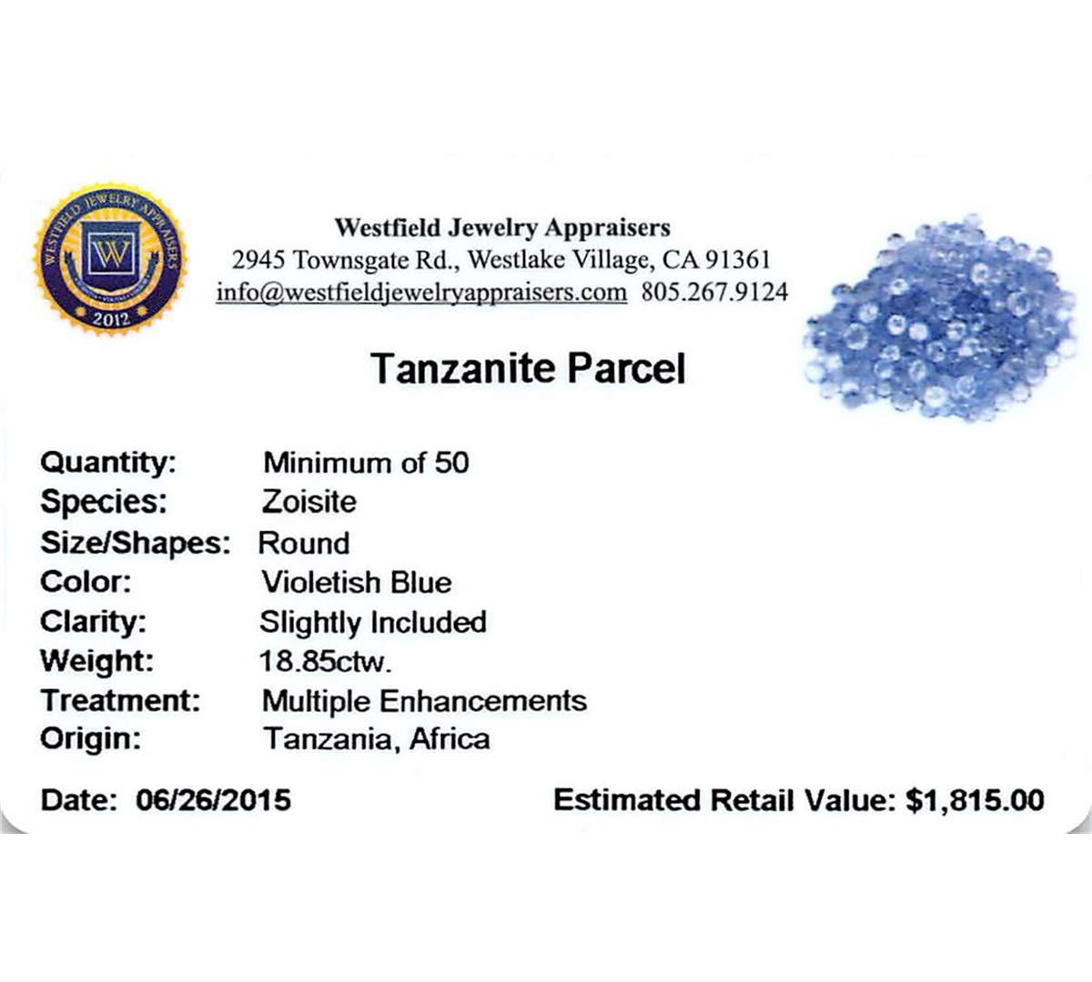 Fifty round mixed cut natural tanzanites, measuring 2.00 - 2.00 x 1.30 mm, exact total weight 18.85ct., clarity is slightly included, type I, medium light, very slightly grayish, violetish blue color, (GIA vB 4/3), cut is good. Measurements & the color grade are an average for the group, Color grade is an average for the group, Transmitting light with no distortion, transparent, Naturally occurring internal & external characteristics are present, Indications of multiple laboratory enhancements, including high temperature heat treatment. Westfield Appraised at $1,815.00.