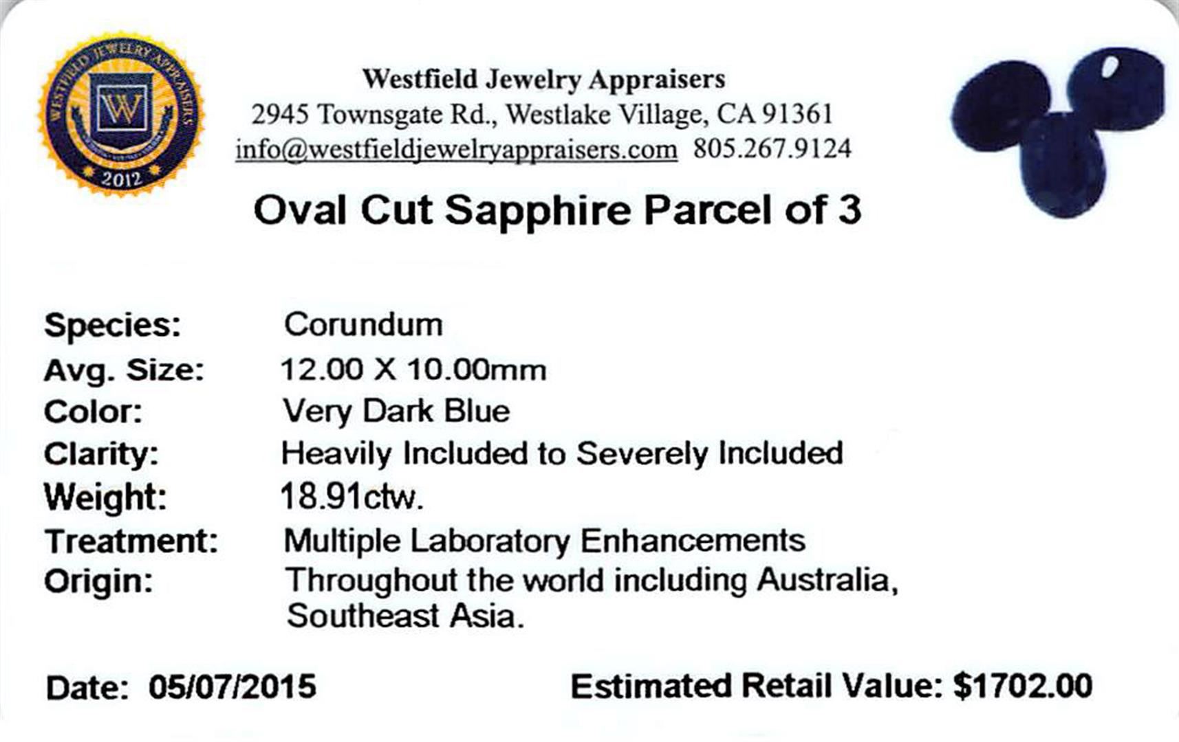 Three oval cut sapphires, measuring 12.00 x 10.00mm, approximate total weight of 18.91ct., clarity is heavily included to severely included, very dark blue color. Indications of multiple laboratory enhancements. Westfield Appraised at $1,702.00.