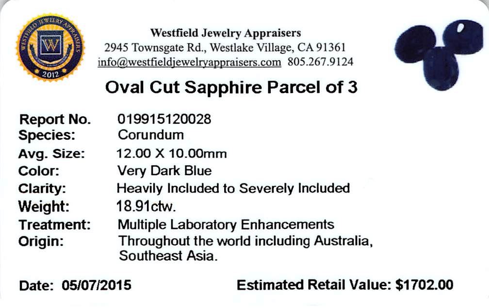 Three oval cut sapphires, measuring 12.00 x 10.00mm, approximate total weight of 18.91ct., clarity is heavily included to severely included, very dark blue color. Indications of multiple laboratory enhancements. Westfield Appraised at $1,702.00.