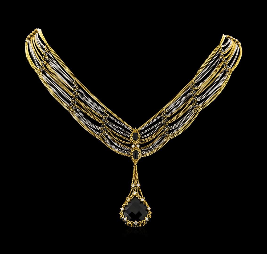 One electronically tested 18KT yellow and white gold ladies custom cast & assembled onyx and diamond necklace with a bright and satin finish. Seventeen and one-half inch wearable length necklace features a dangle consisting of an onyx set within a white diamond accented wrap suspended from a rigid black cabochon and white diamond center. The necklace is supported by multiple yellow gold and white gold draped chains with black diamond beads, transitioning into two onyx bead accents, terminating in a "s" hook clasp. Trademark is ANTHONY NAK. Identified with markings of "18K". Condition is good. Containing: One pear mixed cut natural onyx, measuring 19.00 x 20.00 x 8.00mm, approximate weight of 15.85ct., black, moderately strong, black color, (GIA Bl 10/4), cut is good. Transmitting light very diffusely, opaque. Naturally occurring internal & external characteristics are present. Graded in the setting. Two marquise cut natural onyxs, measuring 10.00 x 4.00 x 2.55mm, approximate total weight of 1.00ct., black, moderately strong, black color, (GIA Bl 10/4), cut is good. Transmitting light very diffusely, opaque. Naturally occurring internal & external characteristics are present. Measurements & the color grade are an average for the pair. Graded in the setting. Two bead set oval cabochon cut natural onyxs, measuring 7.50 x 5.00 x 3.95mm, approximate total weight of 2.08ct., black, moderately strong, black color, (GIA Bl 10/4), cut is good. Transmitting light very diffusely, opaque. Naturally occurring internal & external characteristics are present. Measurements & the color grade are an average for the pair. Graded in the setting. Twelve prong set round brilliant cut diamonds, measuring 2.00 - 1.90 x 1.17mm (depth est.) approximate total weight of 12 Stones = 0.42ct. Graded in the setting. Clarity: SI-1 to SI-2. Color: G - I Forty-Eight bead set bead cut diamonds, measuring 1.50 x 2.40 x 2.40mm (depth est.) approximate total weight of 48 Stones = 2.10ct. Indications of multiple laboratory enhancements. The specific gravity of black diamond is 3.120 to 3.165. Diamond tester results are non-reactive. Graded in the setting. Clarity Déclassé,. Color: Fancy Black; Irradiated. Total Weight of Colored Stones 18.93ct. Total Weight of Diamonds 2.52ct. Total Weight of Necklace 41.85gm. AIG Appraised at $13,450.00.