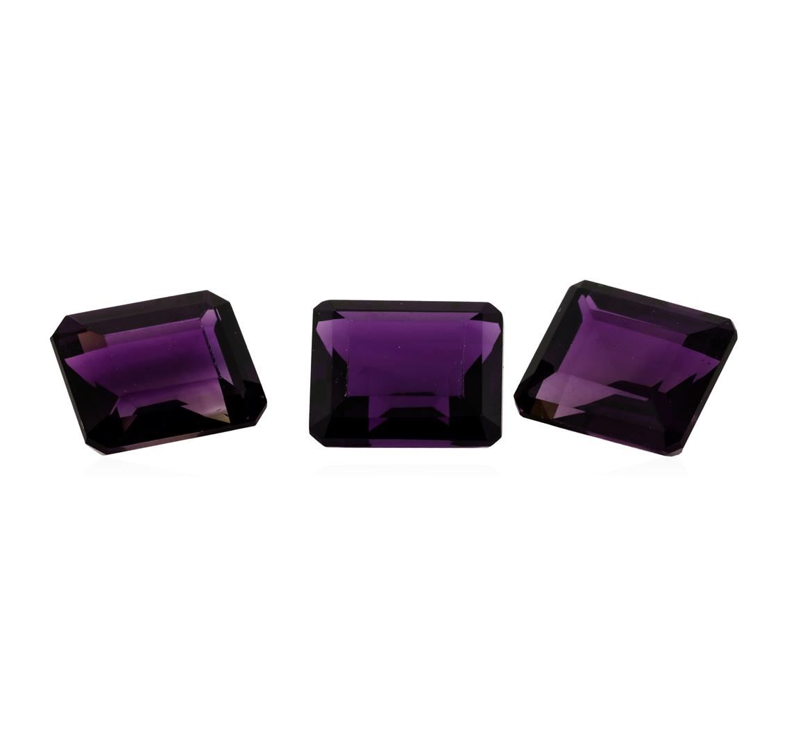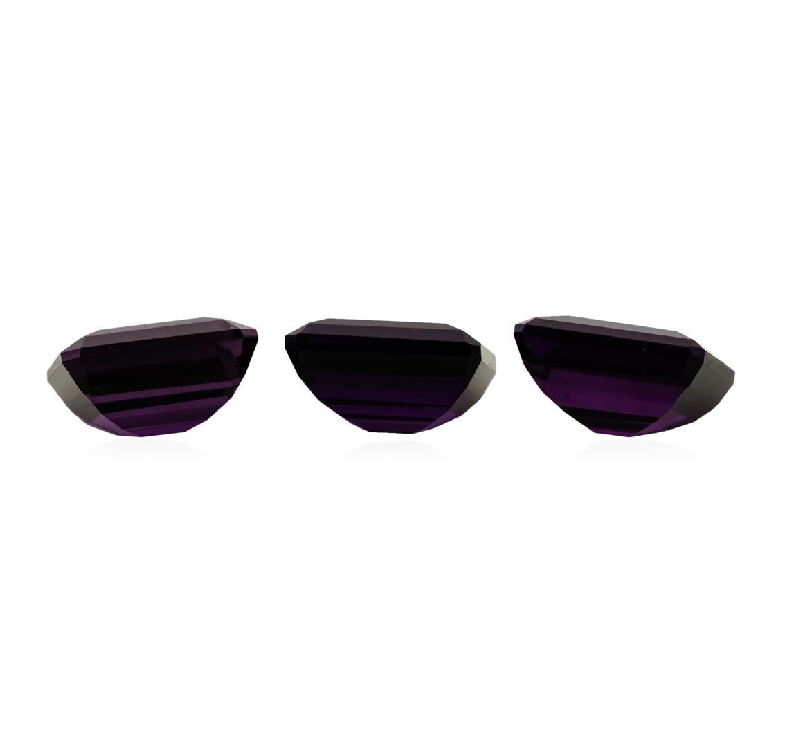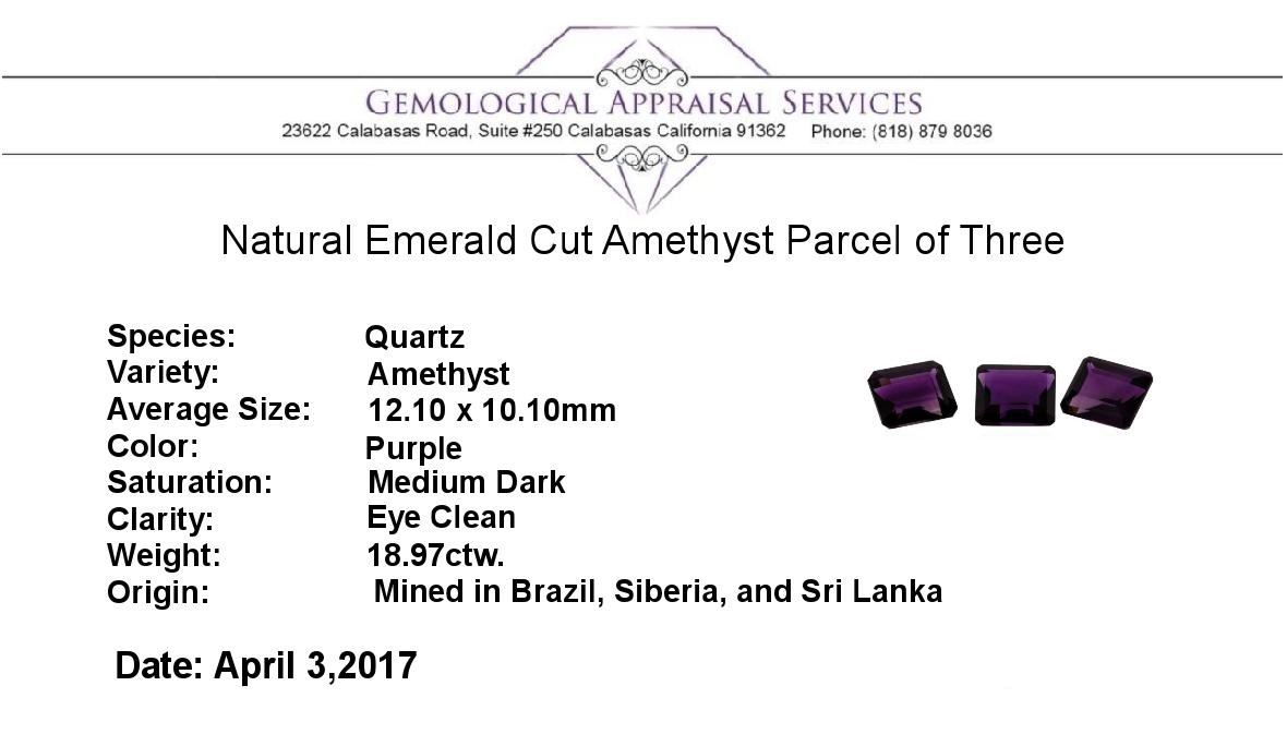One natural emerald cut amethyst parcel of three with an exact weight of 18.97ctw., clarity is eye clean, purple, medium dark. Gemological Appraisals Services estimates the retail value at $644.98 GAS Appraised.