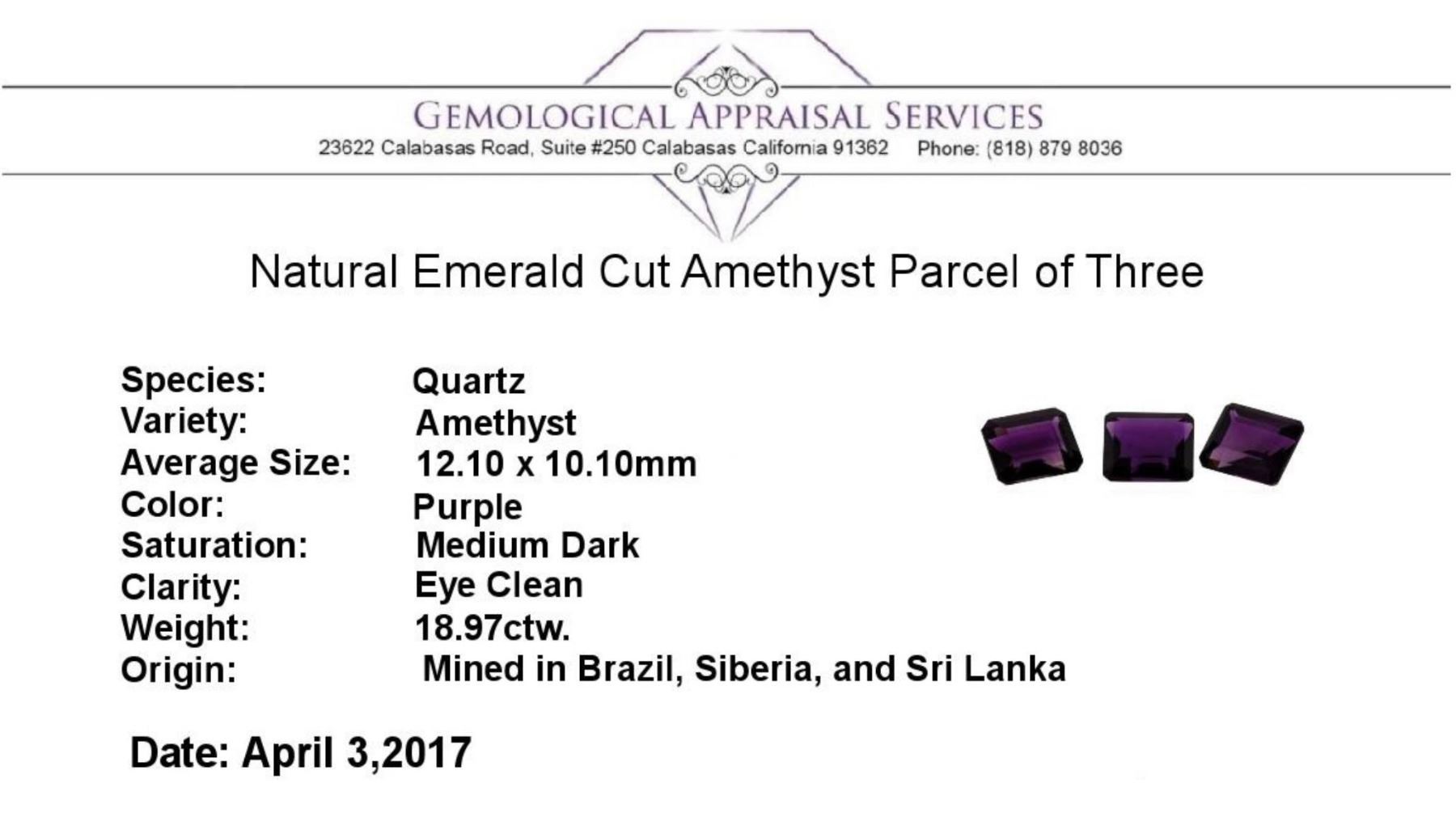 One natural emerald cut amethyst parcel of three with an exact weight of 18.97ctw., clarity is eye clean, purple, medium dark. Gemological Appraisals Services estimates the retail value at $644.98 GAS Appraised.