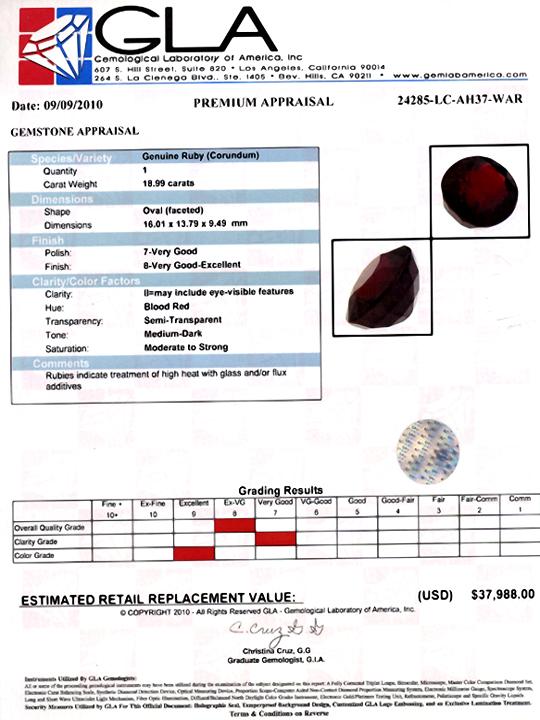 In the event that an item is listed as having an "Appraisal Estimate", this represents WAR's in-house estimate of what the item would appraise for at Gem Labs of America (GLA), Beverly Hills, CA. Actual appraisal of the item at GLA is the responsibility of the Bidder, however WAR may assist, at its discretion, in related logistics. WAR does provide the following guaranty (the "WAR 5% Loose Gem Guaranty") relative to Appraisal Estimate values of LOOSE GEMS: In the event that the GLA appraised value is not such an amount that the Bidder's winning bid is five percent (5%) or less of the GLA appraised value, then WAR, in it's discretion, will either refund such amount of the Bidder's winning bid and related charges so that the winning bid equals five percent (5%) of the GLA appraised value, or, instead issue a full refund on the item and reimburse the Bidder for the GLA appraisal fees. The Bidder may also opt to retain the item, in which case the WAR 5% Gem Guaranty shall not apply relative to the particular item.
