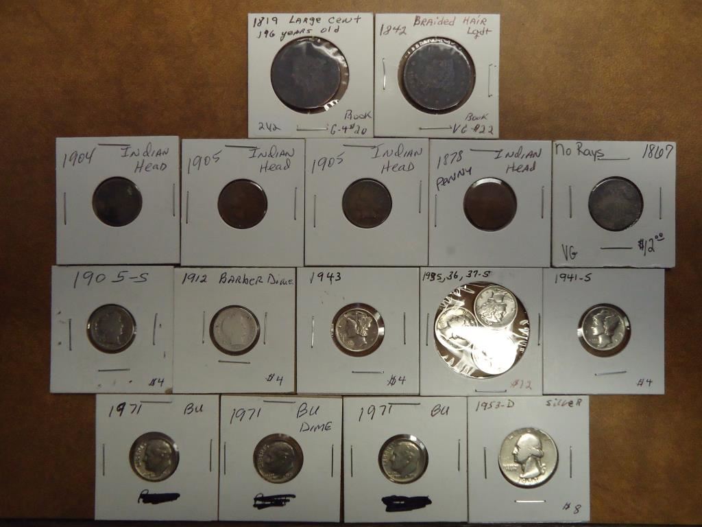 1819 & 1842 US LARGE CENTS, 1878, 1904 & 2-1905 INDIAN HEAD CENTS, 1867 NO RAYS SHIELD NICKEL, 1905-S & 1912 BARBER DIMES, 1935, 1936, 1937-S, 1941-S & 1943 MERCURY DIMES, 3-1971 ROOSEVELT DIMES BU AND 1953-D