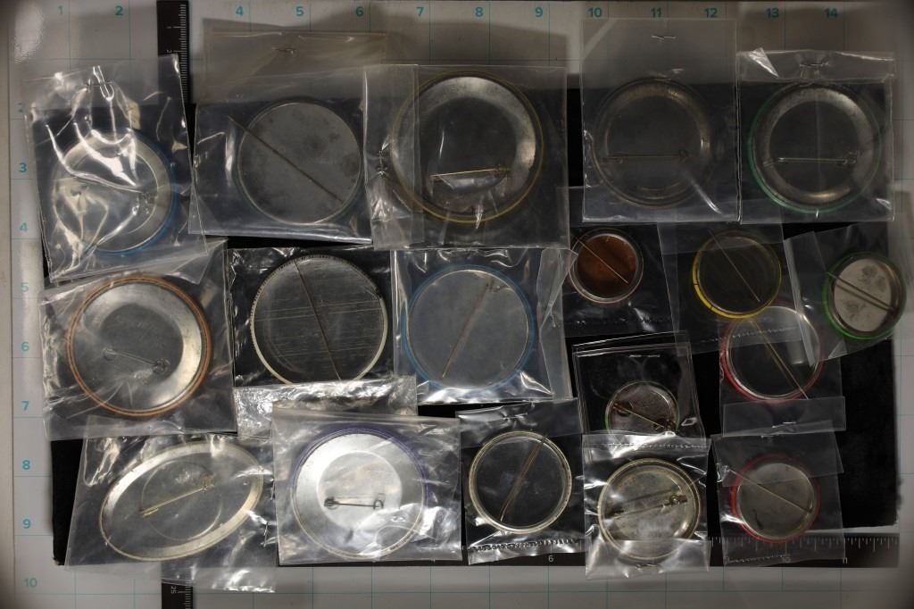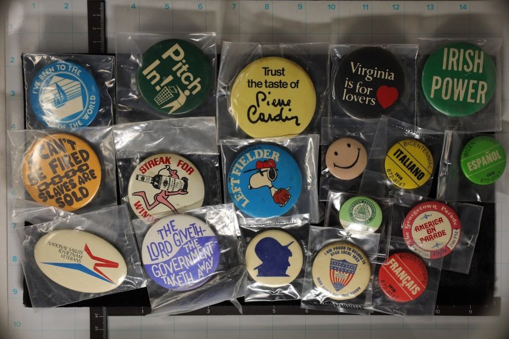 PARADE, THE LORD GIVETH - THE GOVERNMENT TAKETH AWAY, BICENTENNIAL BUTTONS FOR FRANCAIS, ESPANOL , ITALIANO AND OTHERS