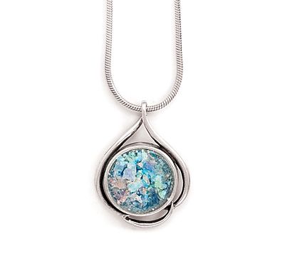 1mm wide oxidized snake chain with lobster clasp. Ancient glass measures 14mm in diameter.Color will vary.Comes with Certificate of Authenticity. .925 Sterling Silver