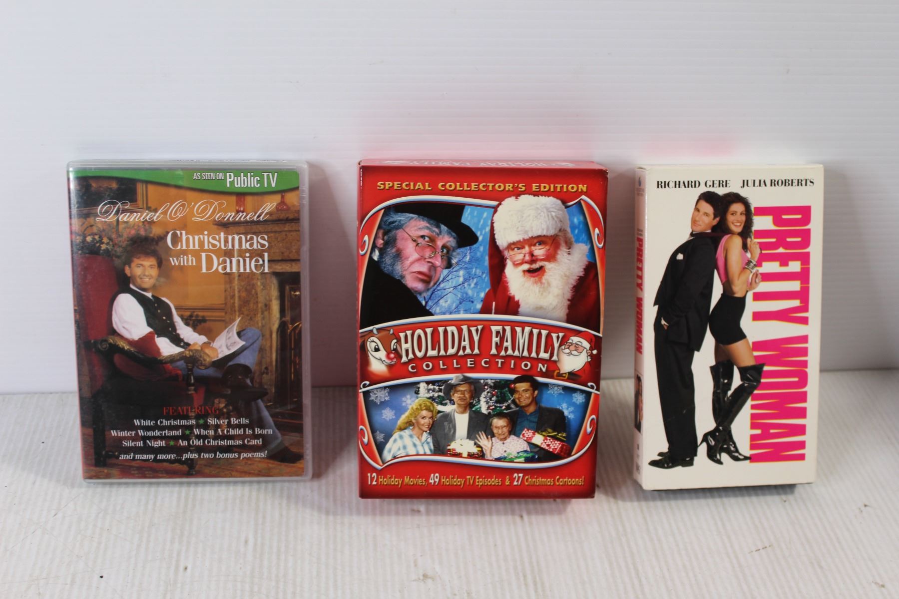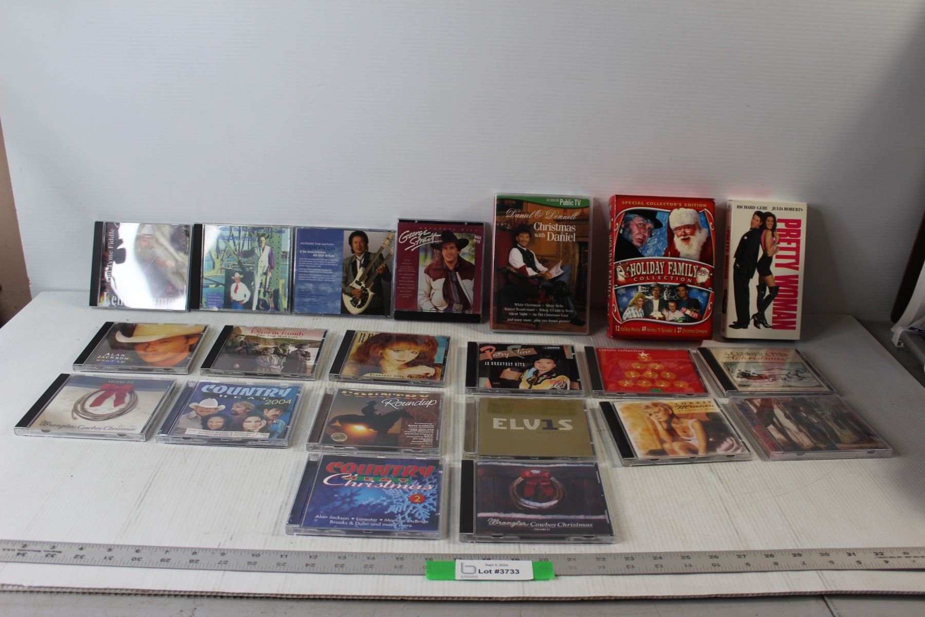 (18) Assorted CD's: Elvis 30 Number 1 Hits, Country Heat 2004, A Currier And Ives Christmas, Christmas With Daniel DVD, Holiday Family Collection DVD's, Pretty Women VHS