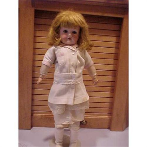 This bisque socket head marked C.M. Bergman 1916 has a good bisque head and a fair composition body. Body is sturdy but was strung wrong--see pictures.She has brown sleep eyes and a very faint cheek rub that does not show in the picture.- The outfit and shoes may be original. Dress is so cute but needs laundering. The shoes are pink to match trim of the outfit but they are worn. I think the wig is an old replacement and I am not sure if it is HH or not. The outfit depicts a walking suit for girls in the early 1900's and is so appropriate. Good doll for the price.