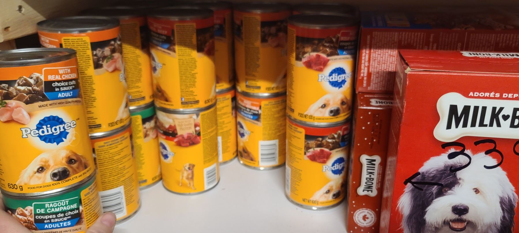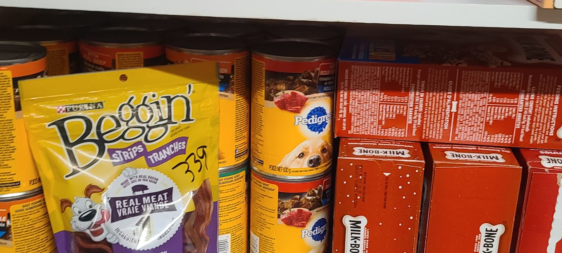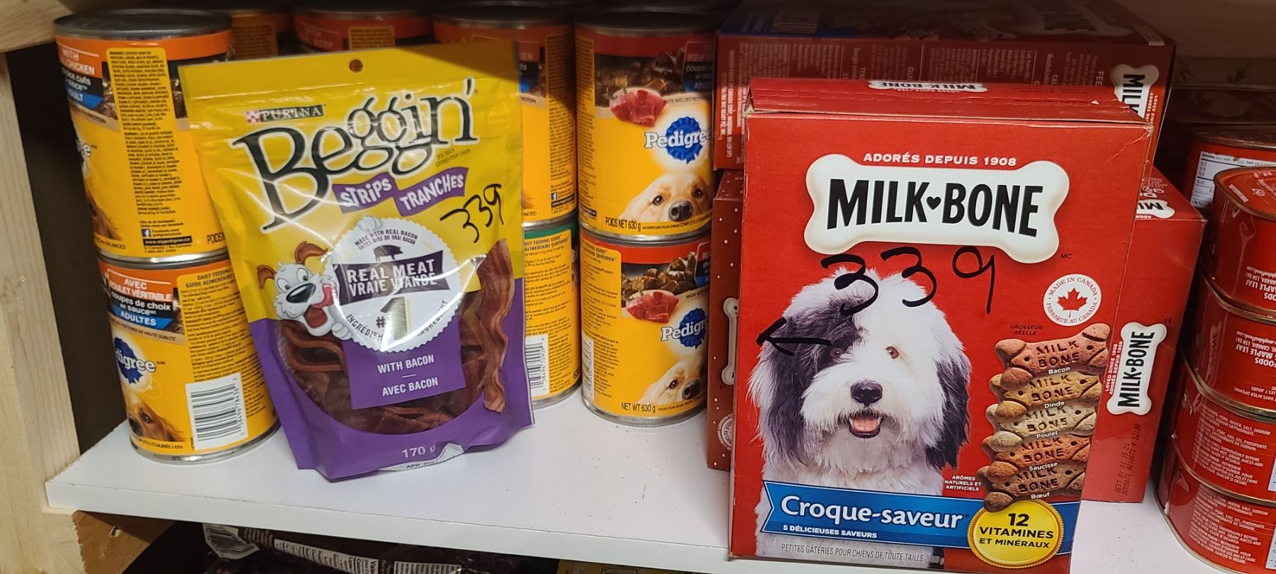 18 CANS OF DOG FOOD, 5 BOXES OF DOG TREATS, AND BEGGIN SNACKS