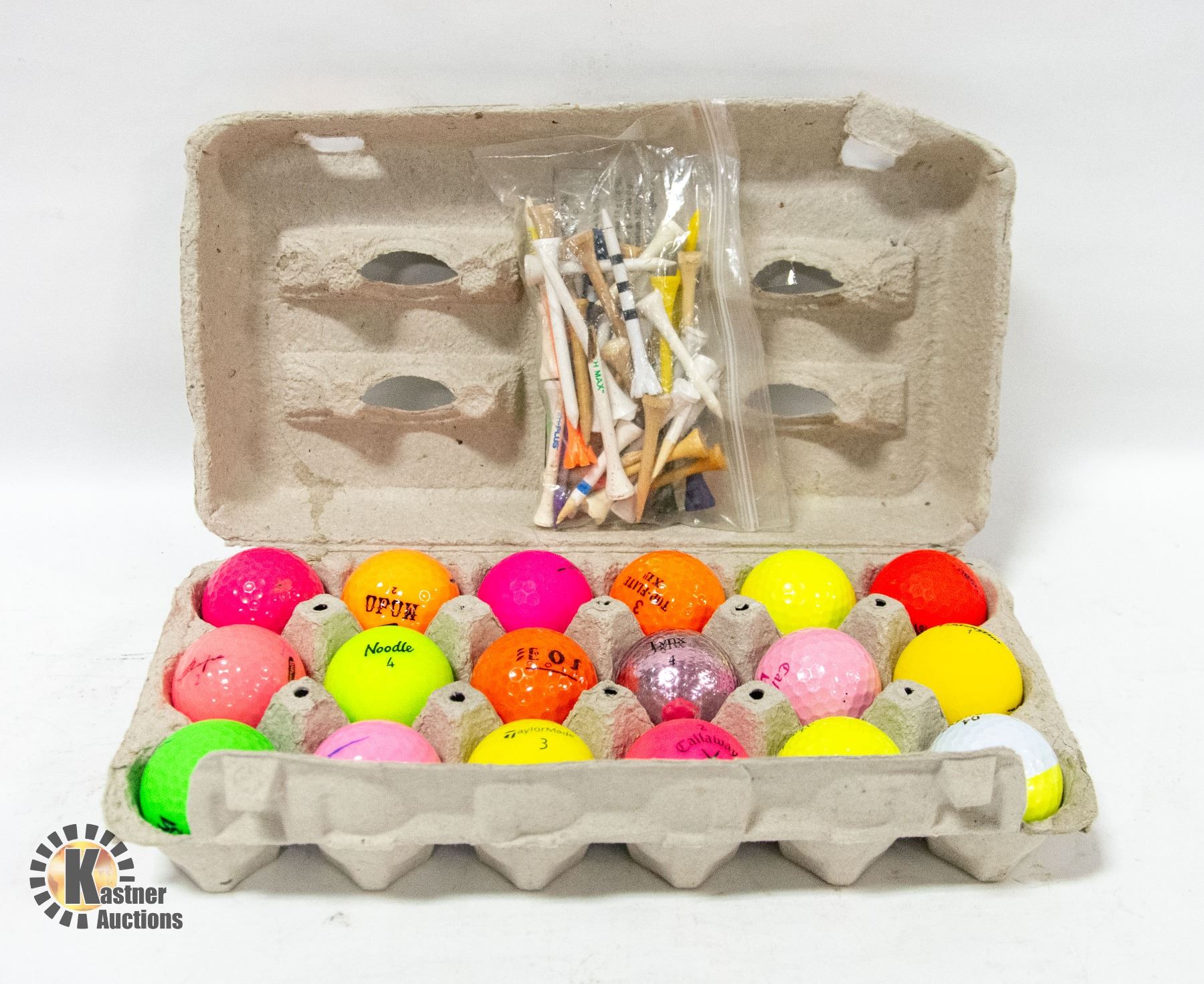 40 ASSTD SIZE TEES + MIXED BRAND COLOUR GOLF BALLS **ALL ITEMS MUST BE REMOVED BY 5PM SATURDAY, APRIL 27TH 2024. ALL REMAINING ITEMS WILL BE SUBJECT TO A $6.00 PER DAY STORAGE CHARGE. ANY ITEMS REMAINING AFTER MONDAY, MAY 10TH 2024 WILL BE CONSIDERED FORFEITED. NO REFUNDS WILL BE ISSUED FOR FORFEITED ITEMS. TO SCHEDULE A PICK UP APPOINTMENT CLICK HERE