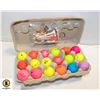 18 USED COLORED GOLF BALLS, MIXED SIZES OF USED TEES