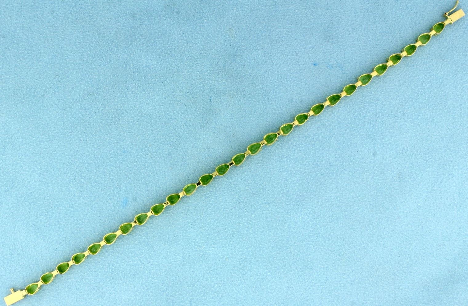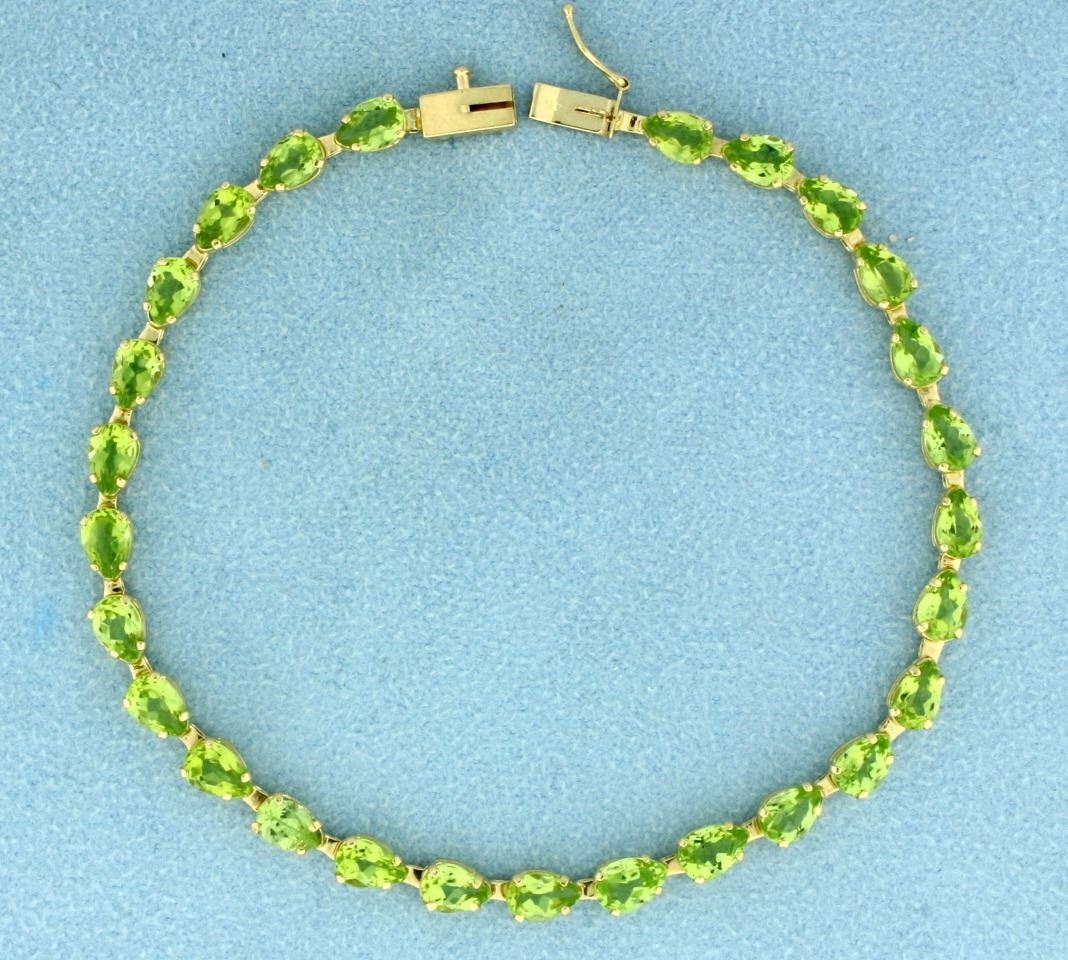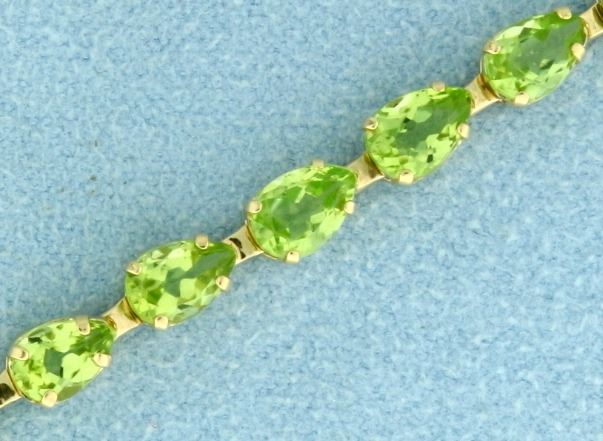 In 14k yellow gold. Contains twenty seven natural 6x5mm pear shaped peridot gemstones with vibrant green color and excellent clarity. 8" long, with safety clasp. 6.2g.