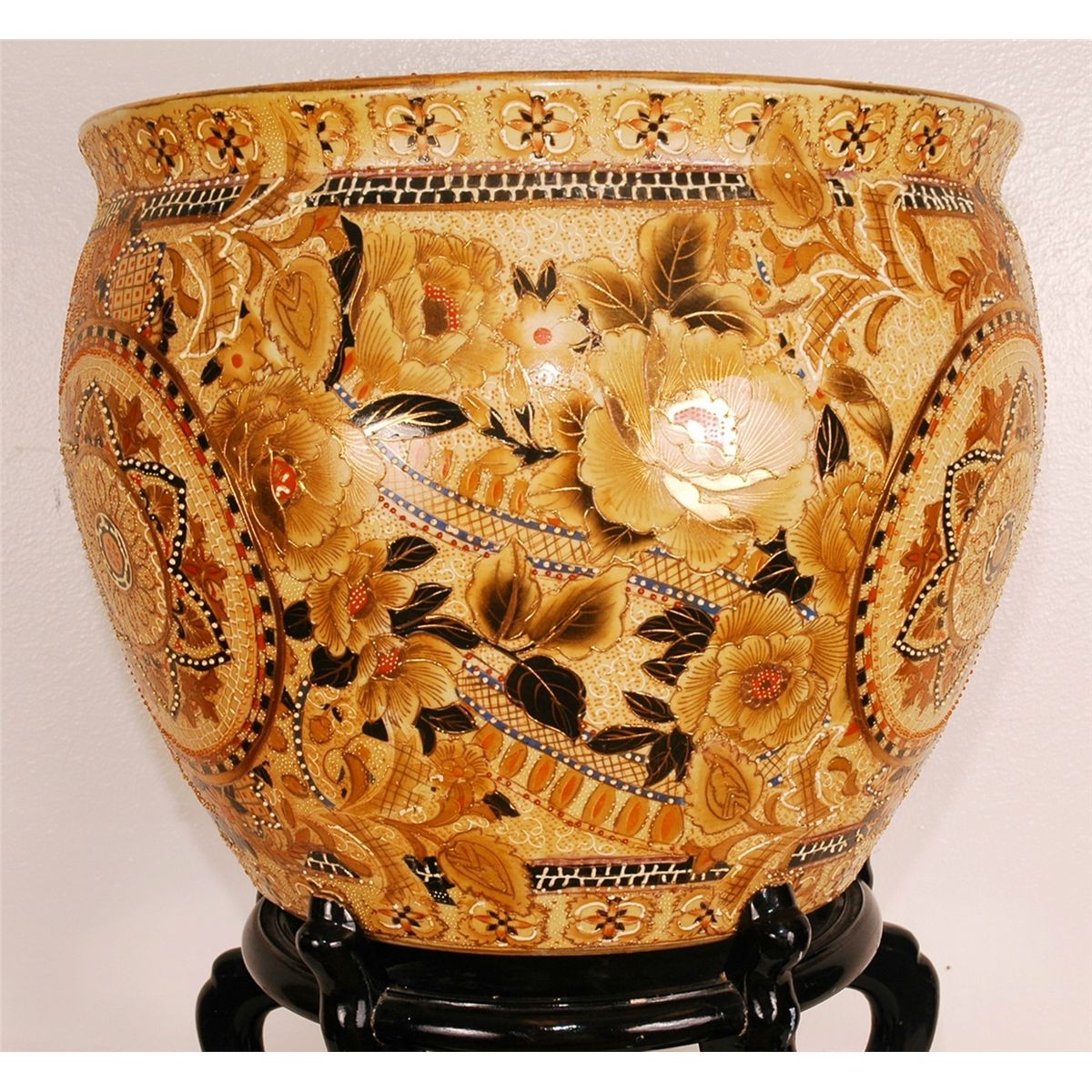 18" Chinese Porcelain Planter / Fish Bowl with Base, hand painted and had decorated. Gold and back floral design. Measures 18" Diameter x 15" H. Includes a wooden stand