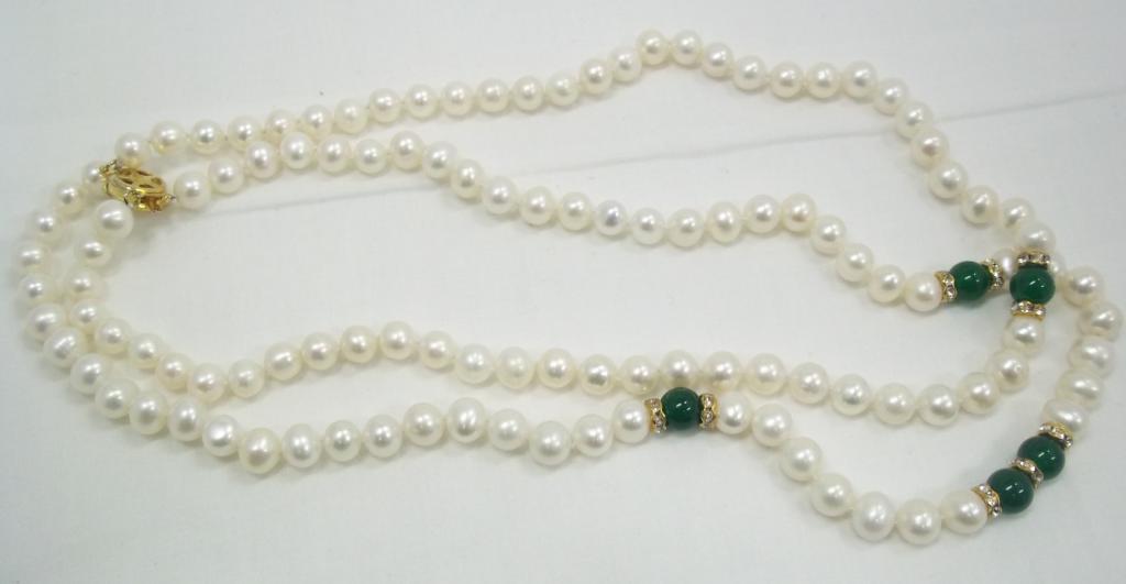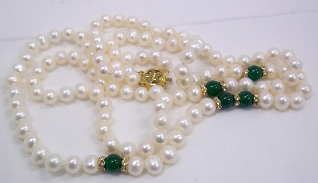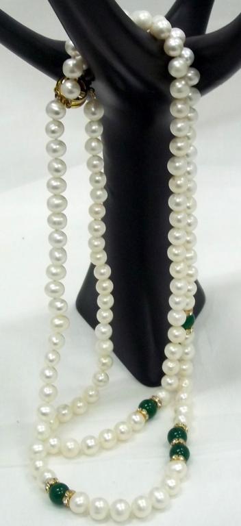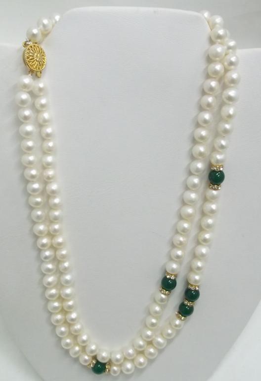 This beautiful two strand necklace is strung with 8mm fresh water pearls with just a few roundells and green beads to bring out the pearls natural beauty. The retail value is $1320-.