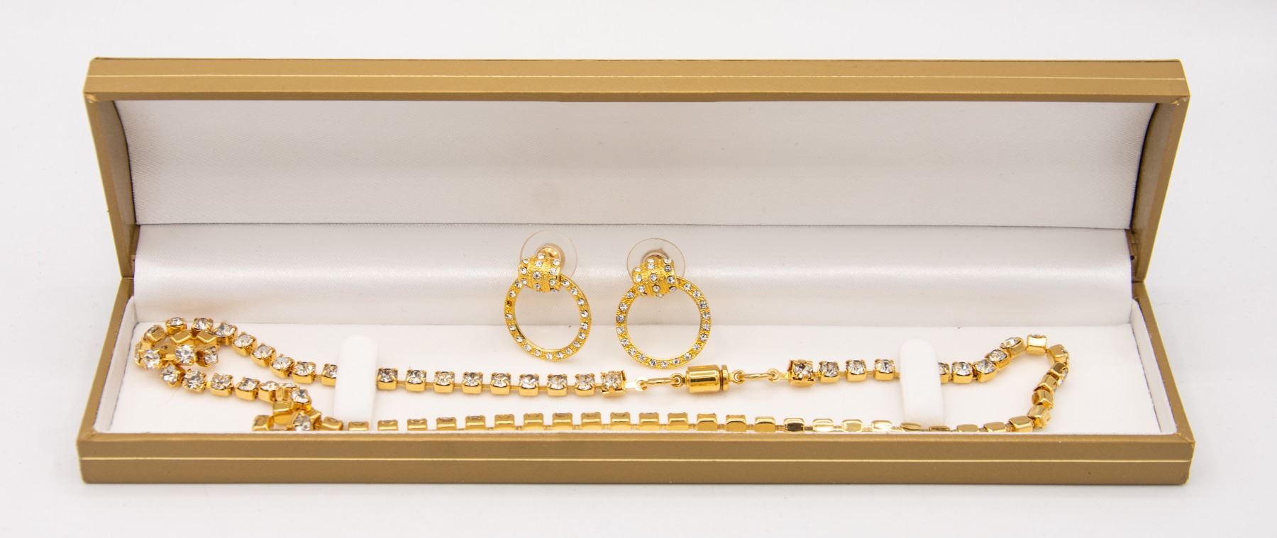 GOLD TONE SETTINGS W/ BARREL CLASP & ROUND MATCHING STYLE DROP EARRINGS **ALL ITEMS MUST BE REMOVED BY 5PM SATURDAY, MARCH 18TH 2023. ALL REMAINING ITEMS WILL BE SUBJECT TO A $6.00 PER DAY STORAGE CHARGE. ANY ITEMS REMAINING AFTER MONDAY, APRIL 3RD, 2023 WILL BE CONSIDERED FORFEITED. NO REFUNDS WILL BE ISSUED FOR FORFEITED ITEMS. TO SCHEDULE A PICK UP APPOINTMENT CLICK HERE