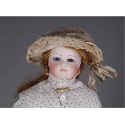 18” FG FASHION. Very fine fashion with blue threaded paperweight eyes, pale bisque, and finely feathered eyebrows. She is on a gusseted kid French fashion body. Wearing a cotton print dress, red leather boots, and retains an antique sandy blonde human hair wig. JL 1-3120
