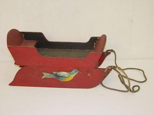 18" FOLKY PAINTED WOODEN CHILDS TOY DOLL SLED IN RED PAINT W/ APPLIED BIRD DECORATIONS - PAINT LOSSES & WEAR;