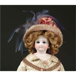 18” GLASS EYED SWIVEL NECK FRENCH FASHION DOLL. Head unmarked, shoulder incised “4,” on all-leather gusseted body, cobalt blue eyes, close mouth with hint of smile, appropriately redressed in ivory silk with pink and gold braid trim, antique undergarments, newer pink cloth shoes. Honey colored human hair wig that is slightly large for the size of the head over original cork pate, topped by an elaborate pink silk hat decorated with cotton netting under silk flowers and feathers. CONDITION: Good quality pale bisque with rosy cheeks, highlighted lips, leather body in sturdy condition with possible repainting to tips of finger to simulate tips of nails. Although maker is unknown, this lovely doll is of Bru quality. RS 1-3568 (1,800-2,500)