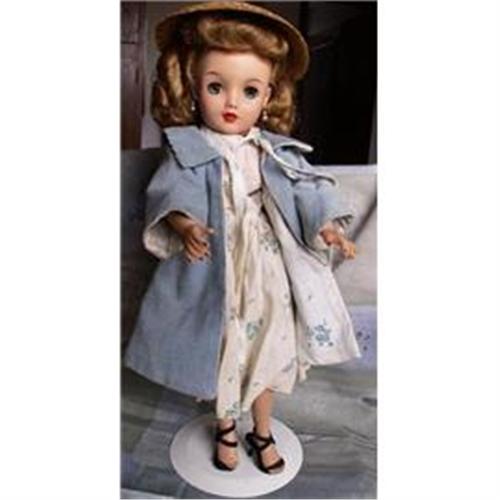 She is also marked with size 18 under each arm and inside each thigh. She has her earrings and pearl necklace and is dressed in panties, slip, nylons, high heels (loose elastic), white handkerchief cotton full dress with tiny flowers and maatching blue corduroy coat lined with the dress material.