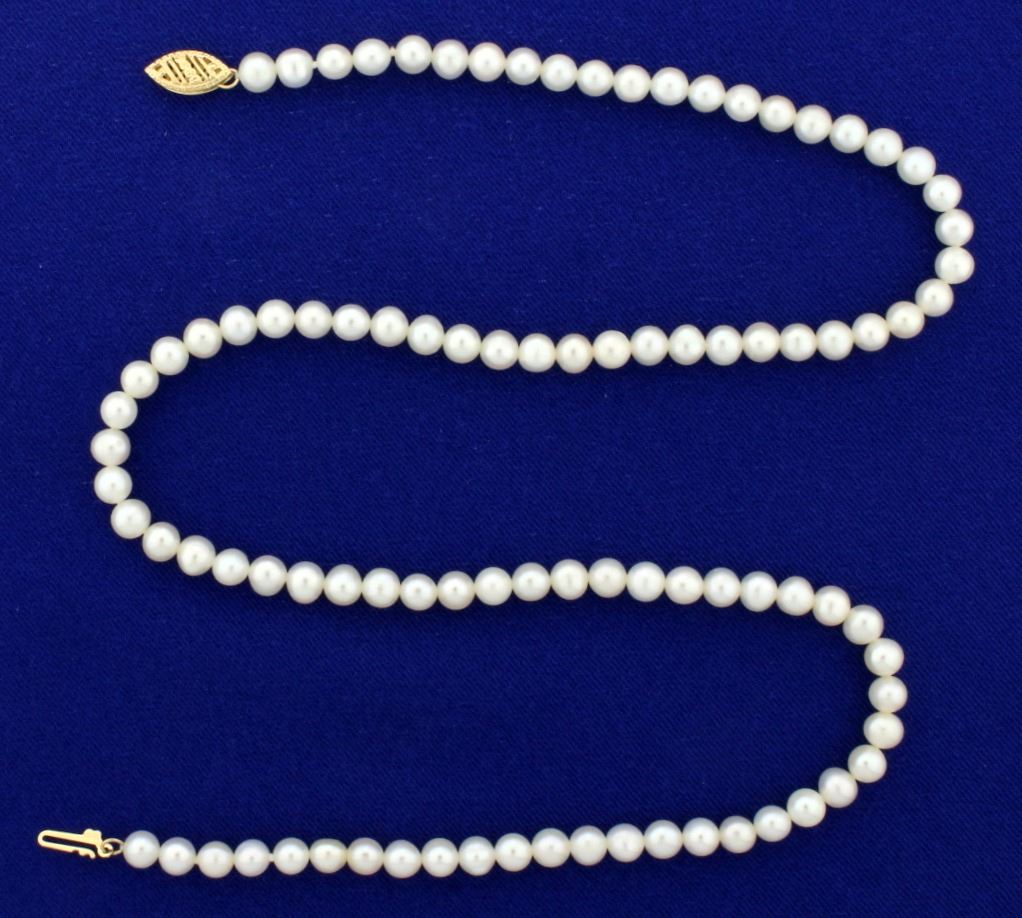In 14k yellow gold. Contains 93 high quality 5mm Akoya Pearls with excellent color and luster. 15.4g