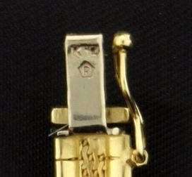It is 14K yellow gold and is 18 inches long and 6mm wide. It has a safety clasp. 31.2g